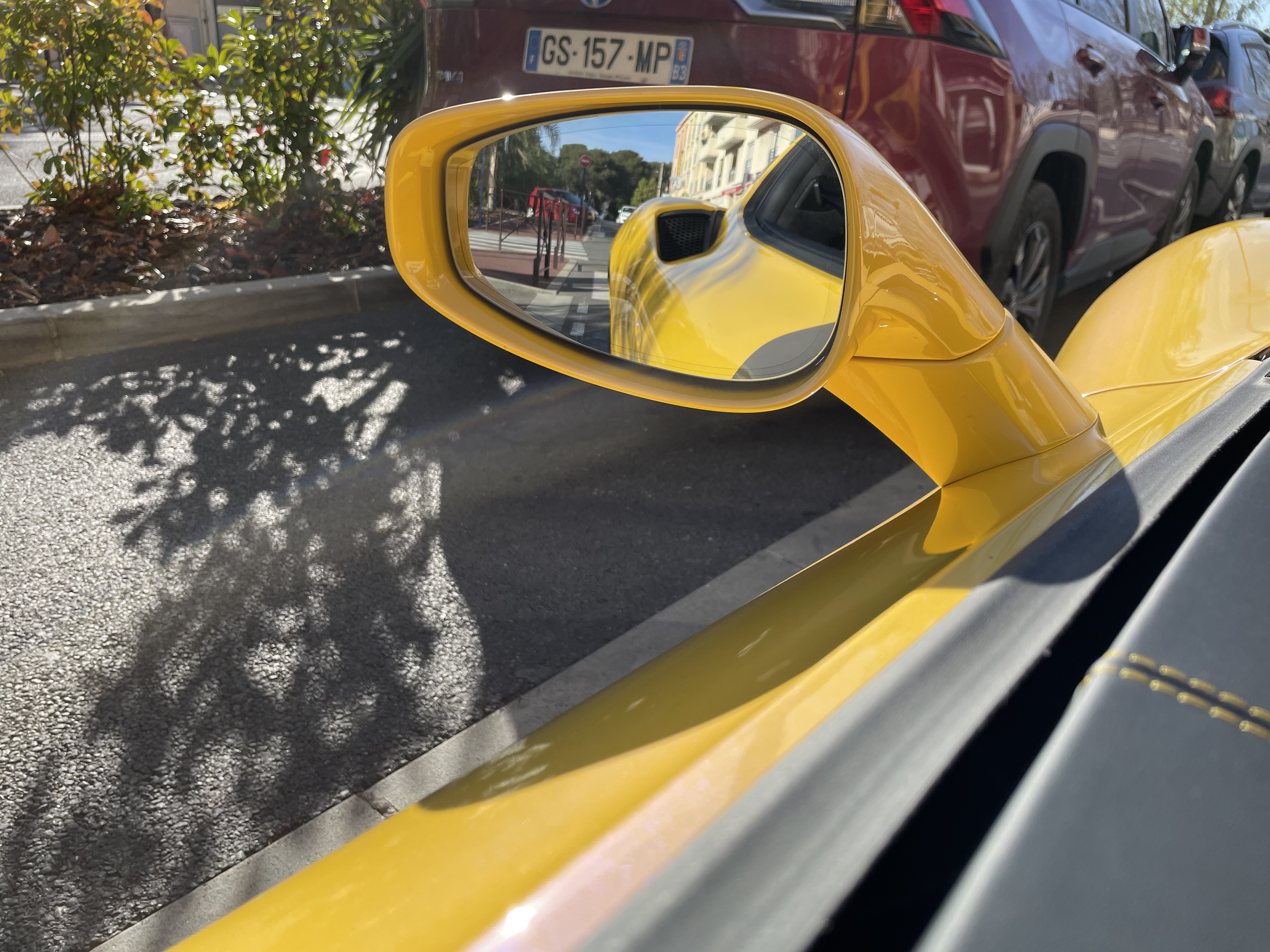 Le seul problème en agglomération, ce sont les ralentisseurs. Michel avait pris l’option du levage électrique de l’avant de l’auto et ça me semble effectivement indispensable de nos jours dans nos contrées. Ce système est vraiment efficace au point de vue hauteur. J’avais fait un repérage d’une partie du trajet avec le diesel de mon épouse la veille et j’avais des doutes pour le village des Adrets, au dessus de Fréjus. Eh bien non, ça passe très bien. Par contre il y a un temps de réalisation du levage qui est quand même de 3 ou 4 secondes bien pleines. Il faut vraiment être très concentré à l’approche des ralentisseurs et ne pas perdre de temps. Michel me dit que parfois il est obligé de s’arrêter avant l’obstacle et d’attendre la levée avant de redémarer doucement. Ça rouspette parfois derrière mais beaucoups comprennent ou se perdent en attendant dans l’admiration de l’arrière magnifique de la MC20 ! De plus, dès qu’on dépasse 30 km/h, l’avant redescend automatiquement ce qui est gênant dans les zones de ralentisseurs successifs. Il faut anticiper et de nouveau réaliser la même opération.