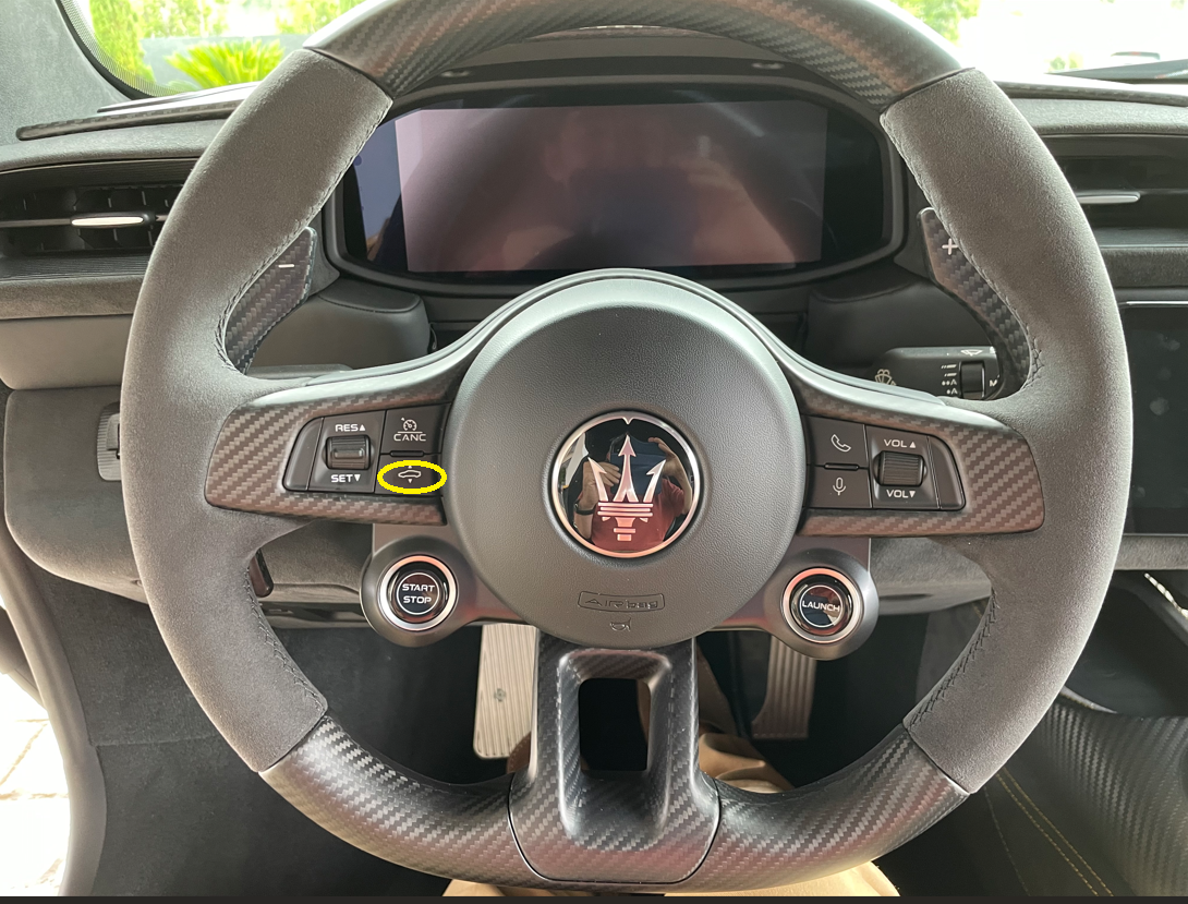 Le bouton au volant cerclé de jaune actionne l’élévation de l’avant. Le volant en carbonne-alcantara est bien en main avec le passage des pouces dans la zone évasée. Les palettes de commande des vitesses sont fixes, ce que Michel préfère et moi aussi.