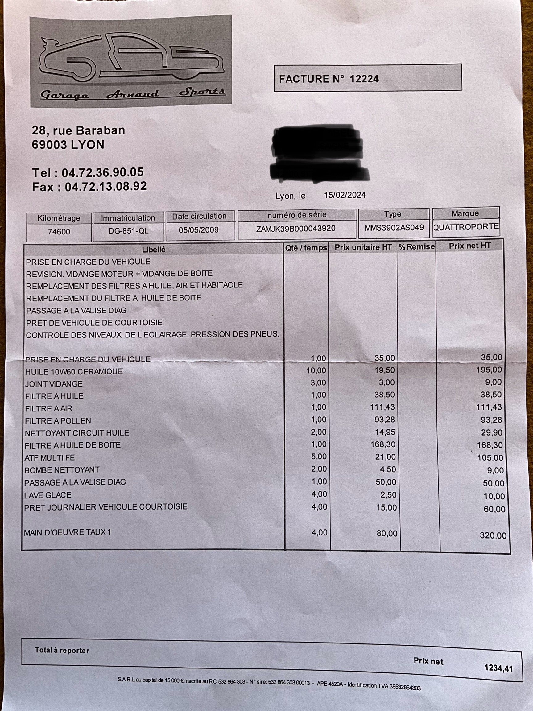 Je viens de faire faire la vidange moteur et vidange de boîte pour ma Quattroporte V 4.7s chez un garage independant de Lyon et le tarif me semble excessif, j’aurais souhaité avoir votre avis: