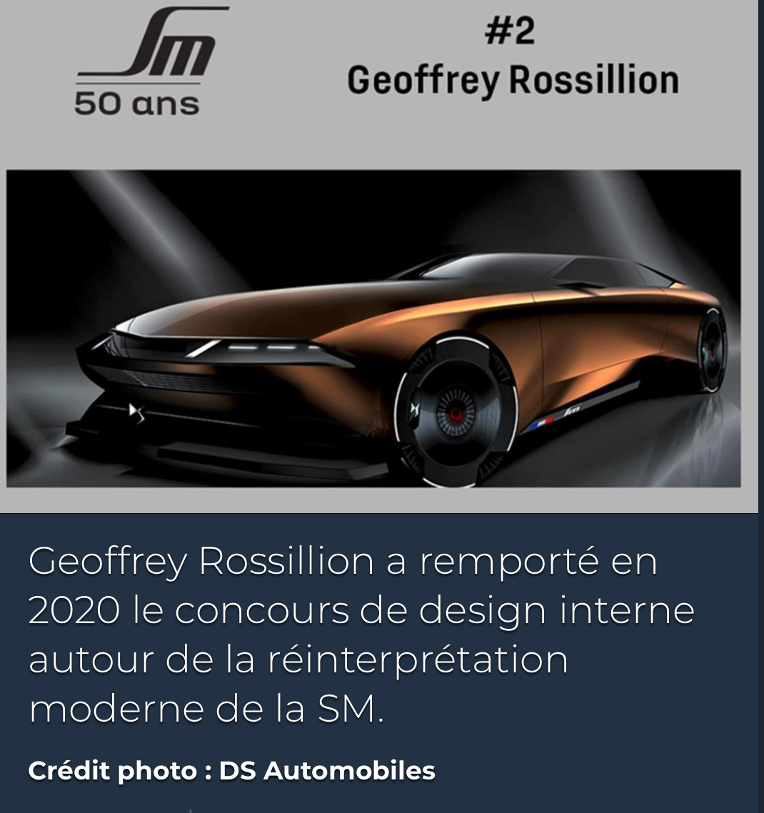 Ah, excusez-moi pour ce déferlement de photos mais c’est pas tous les jours que PSA (qui avait euthanasié la SM originelle) présente un hommage à cette diva. En fait, ce n’était jamais arrivé depuis sa mort en 1975. Il a fallut presque un demi siècle pour se souvenir de ce chef d’œuvre de Robert Opron, de cette voiture qui ne ressemblait à nulle autre et à laquelle nulle autre n'a ressemblé depuis, si ce n'est aujourd'hui ce concept car hommage et quelques autres tentatives récentes émanant de designers privés. Mais ce concept car - ci est signé DS - PSA et porte un nom sans équivoque : SM Tribute, hommage à la SM. Génial ! Merci DS, PSA et Stellantis