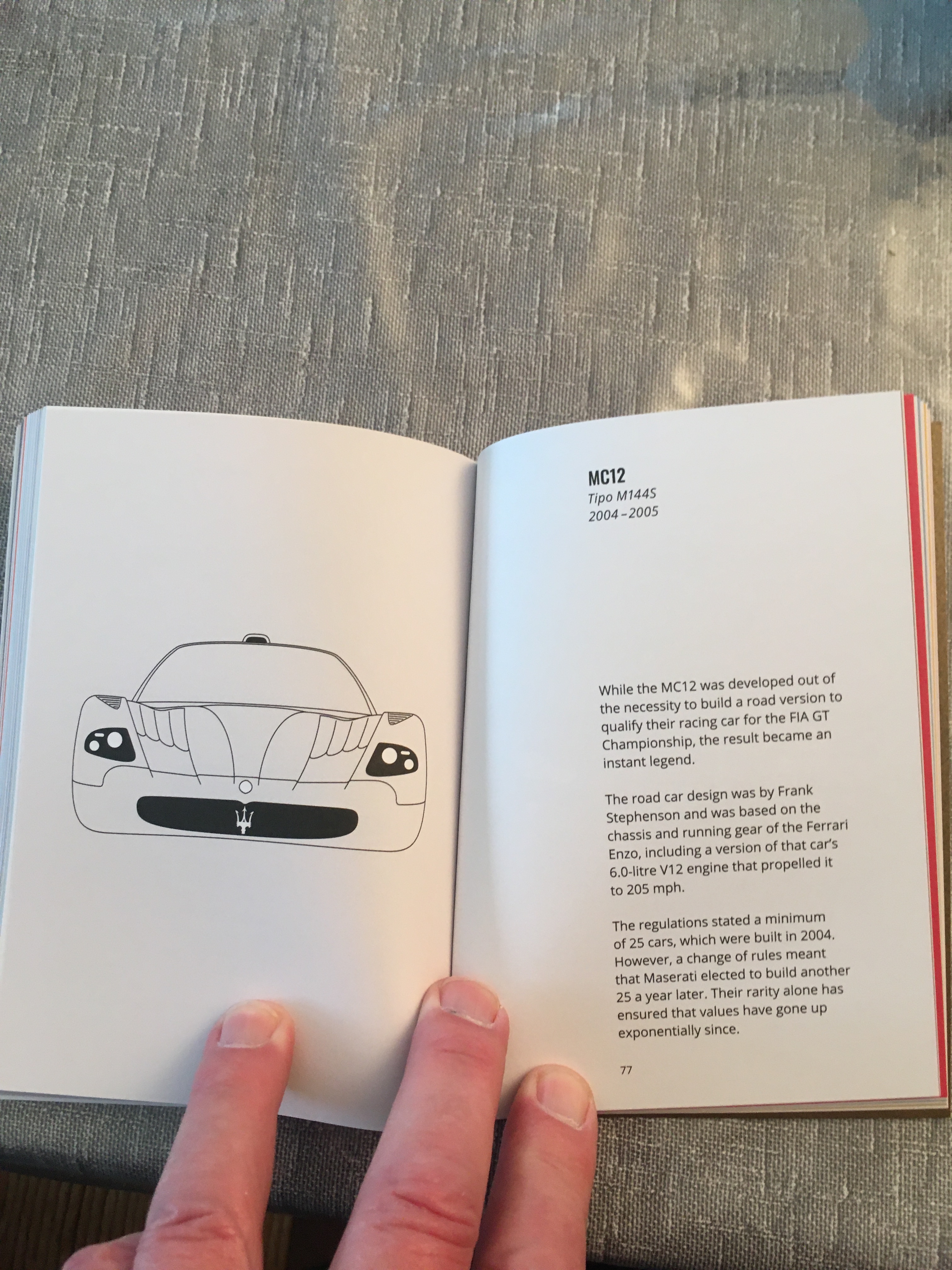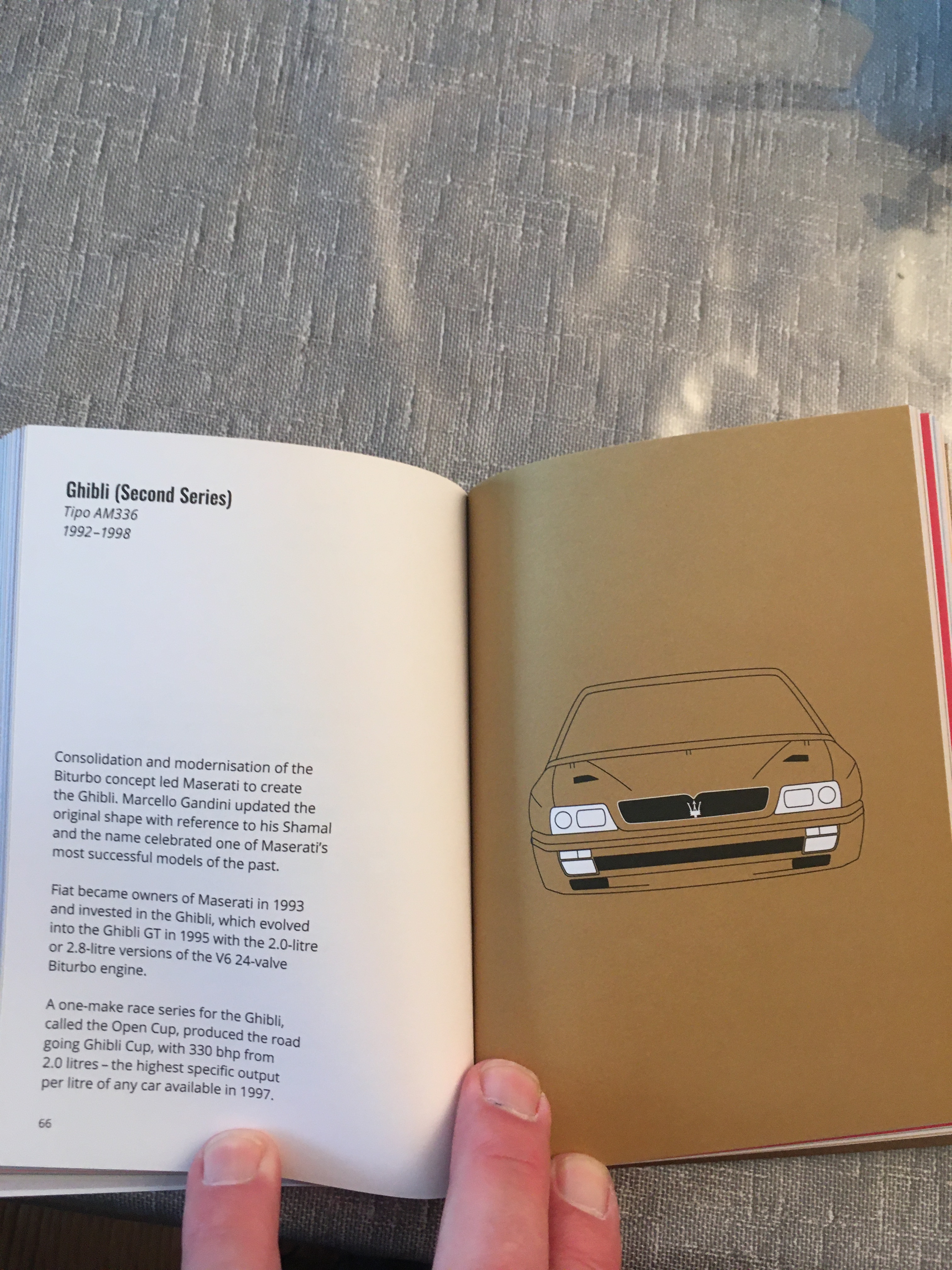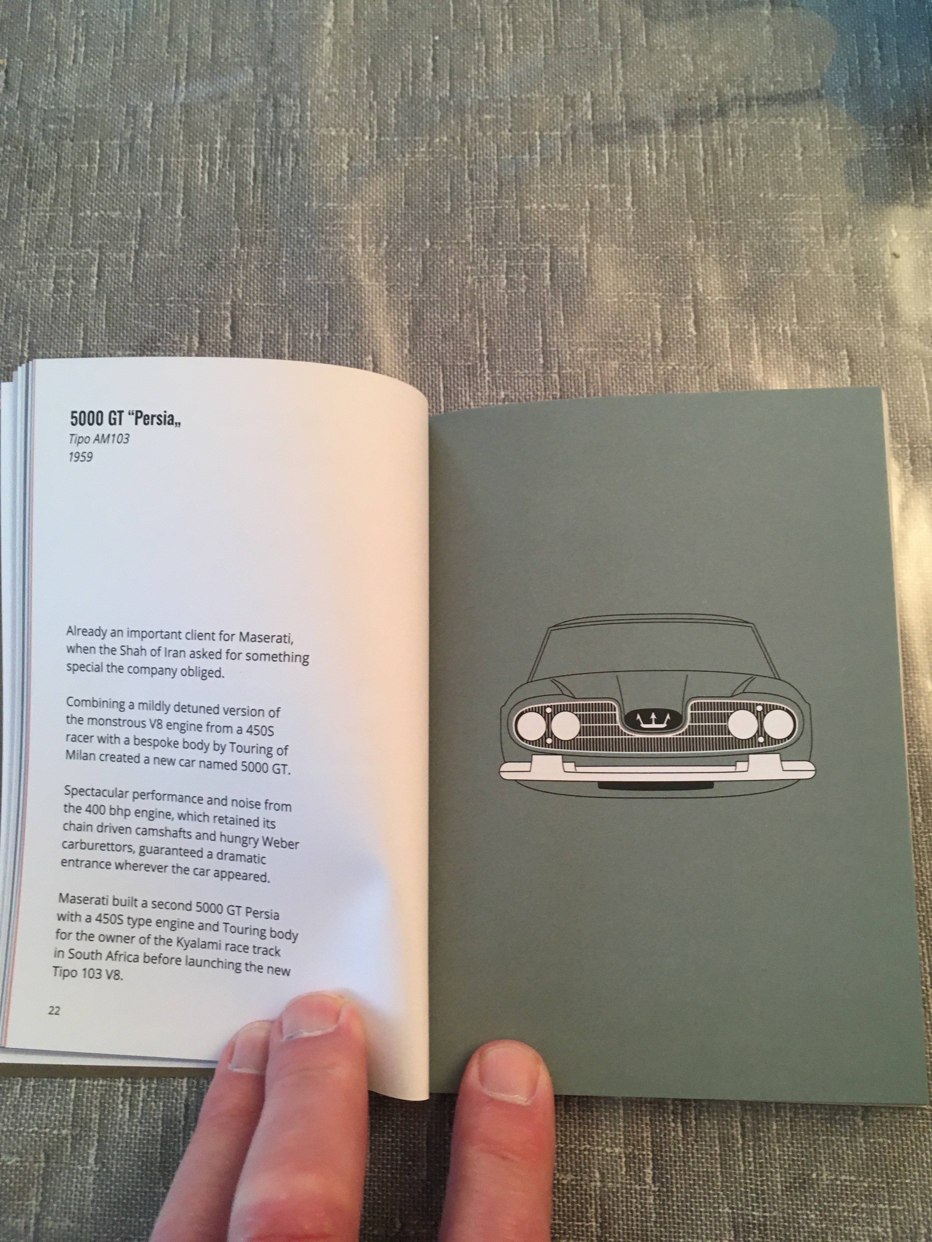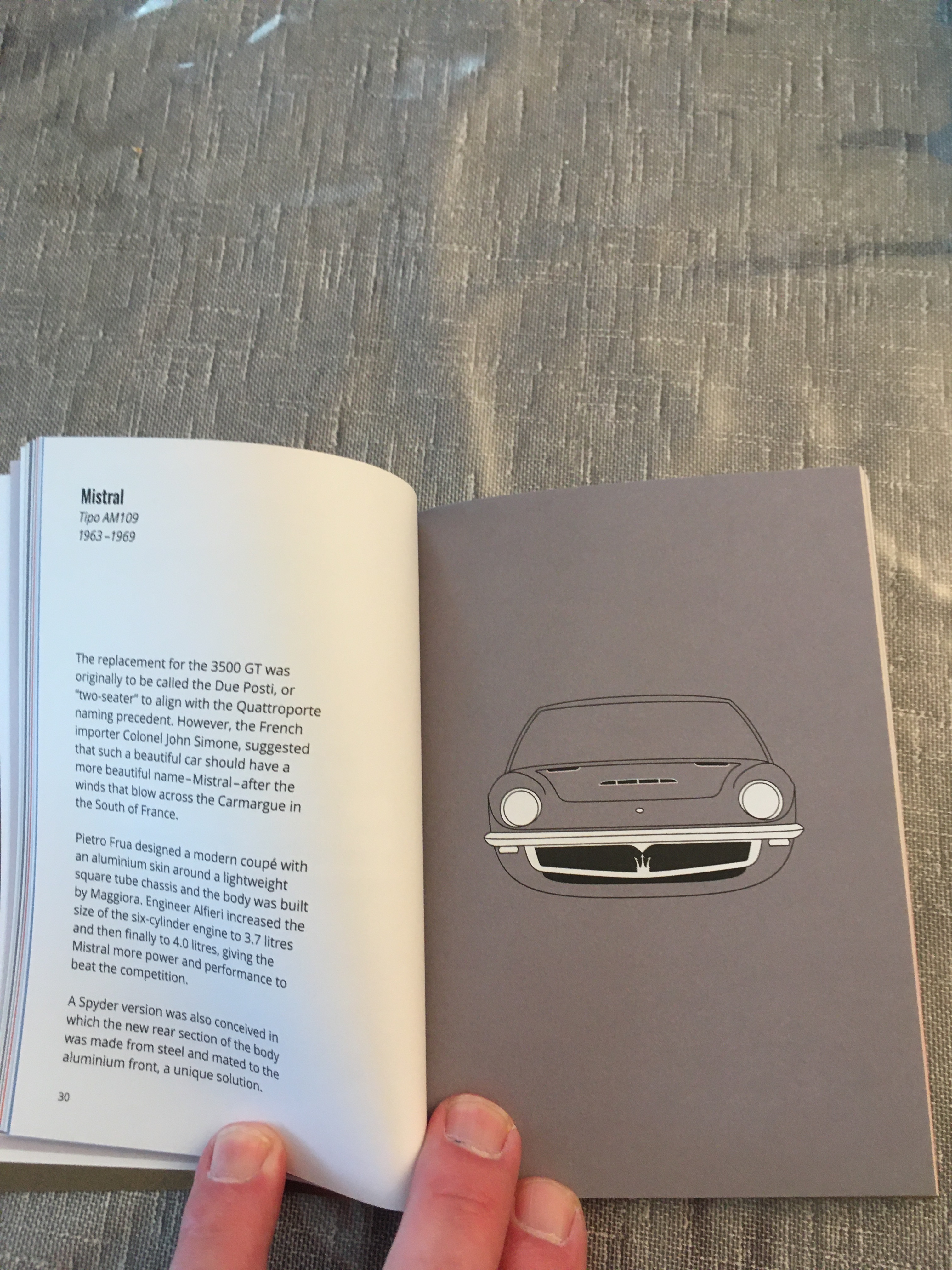 Bref: un petit livret retraçant les 110 ans de Maserati, avec pour chaque modèle une image de l'avant stylisé, et un petit texte:
