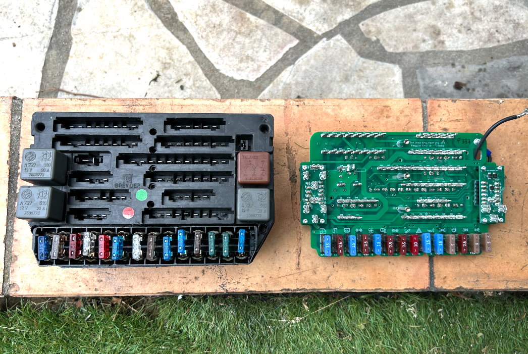 À gauche la boîte à fusible originelle qui est encore dans son boîtier noir. À droite la Biturbox qu’il va falloir installer dans ce boîtier.