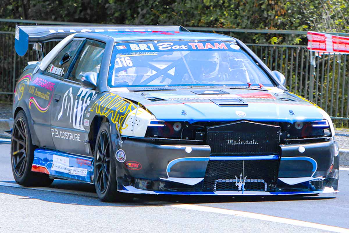 La Ghibli 2 "Hillclimb" du pilote et préparateur italien Bruno Piantoni est équipée du moteur et de la suspension arrière (différentiel et bras oscillants) d'une Ghibli Open Cup et d'amortisseurs et de bras de suspension avant Maserati 3200GT avec freins Ferrari.