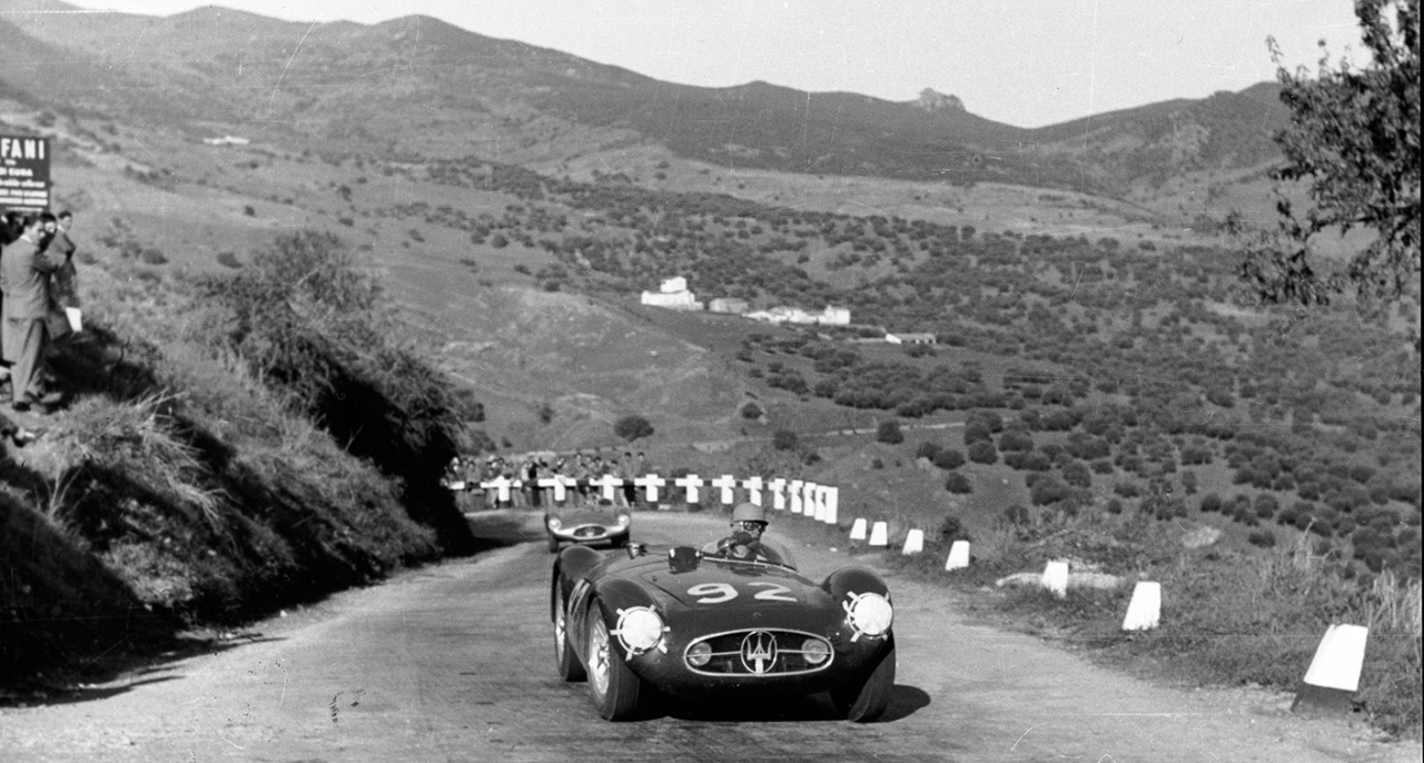 Toujours Maria Teresa à la Targa Florio 1955. La Maserati A6GCS/53 excellait avec ses 170 cv pour 740 kg sur les routes de montagne siciliennes. Maria Teresa terminera 9ième au général, ce qui représentait une bonne performance face à la concurrence de plus forte cylindrée :