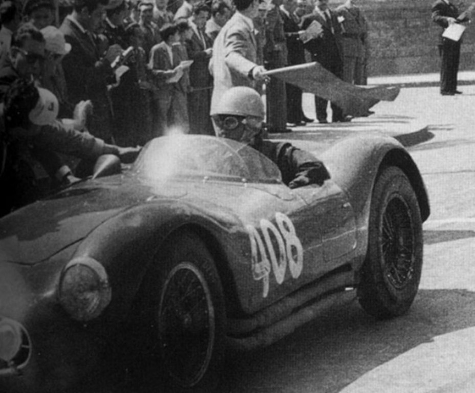 Notre comtesse napolitaine remporta de très beaux succès avec son A6GCS/53, notamment la Catania-Etna 1955 disputée sur les flancs du volcan Etna où elle se classa première au général devant 85 concurrents masculins ! J'aime bien les images saisies en course où l'on perçoit la concentration du pilote et l'effet des forces physiques sur son attitude : Ci-dessous au départ des Mille Miglia 1955 avec son A6GCS/53 privée reconnaissable à sa bulle devant la seule pilote : Ci-dessous aux 1000 km de Buenos aires 1956 ;