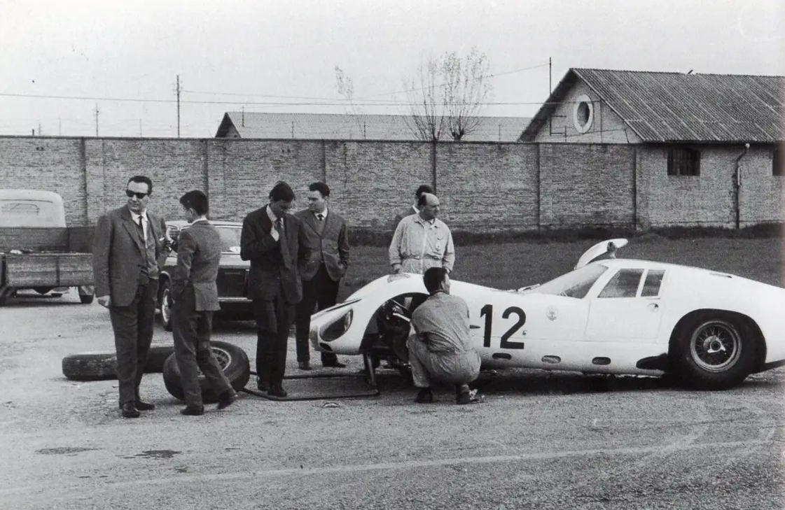 On note le directeur de Maserati, Omer Orsi, avec ses lunettes de soleil à gauche, l’ingénieur Giulio Alfieri à l’avant droit du bolide (les mains dans les poches) et Guerino Bertocchi, le collaudatore, en combinaison blanche. Pas impossible que ce soit le jeune ingénieur Gianpaolo Dallara à l’avant de l’auto, avant qu’il ne parte faire la Miura ?