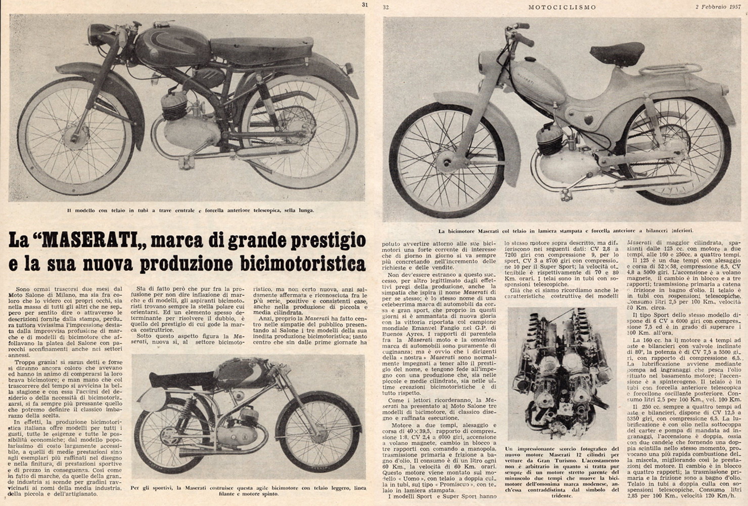 La version 50 T2 U pour Uomo (homme) : La version 50 T2 D pour Donna (femme) : La version 50 T2 SS pour Super Sport (elle atteignait 90 km/h avec sa roue avant carénée) : Ci-dessous un article de 1957 où le distingo pourtant réel entre les voitures et les motos Maserati est à peine entrevu. Elle a bien réussi son coup marketing, Ida Orsi ! Mais le journaliste non dupe souligne que les motos Maserati se devaient d'être à la hauteur et d'honorer leur nom prestigieux. En prime le moteur V12 des 250F V12 ou de la 350S V12 ! Cliquez sur l'image pour agrandir : Elle connut la course, la petite 55 T2 SS :