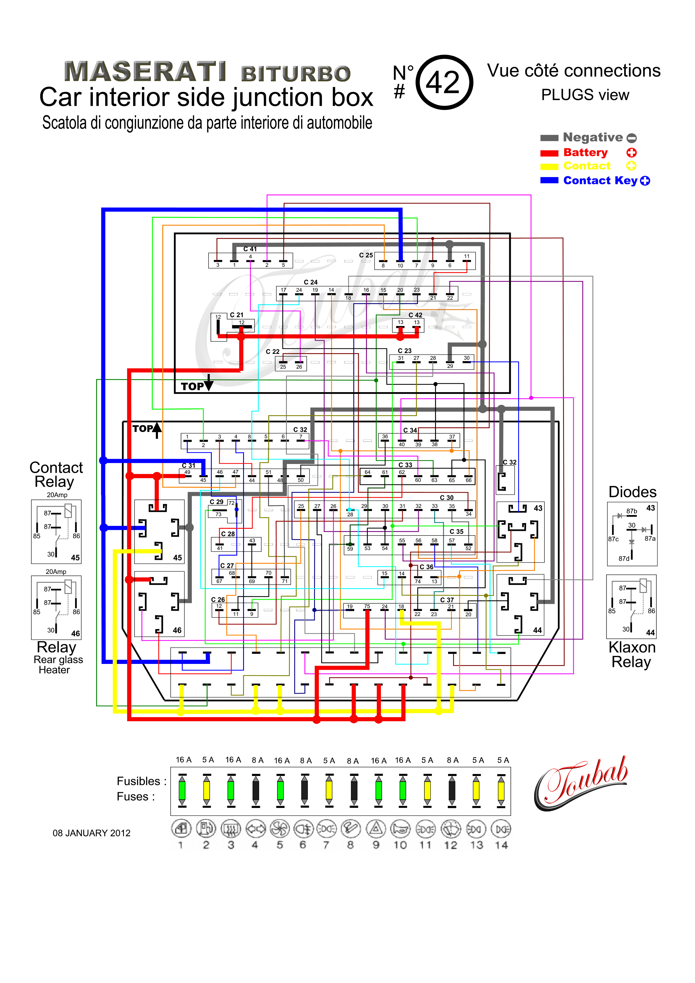J'étais retombé au hasard du net sur un vieux schéma réalisé par Toubab de la boite à fusible des biturbo dont je me suis servi pour vérifier celle de la shamal (http://maseratitude.com/viewtopic.php?f ... 40#p185647).