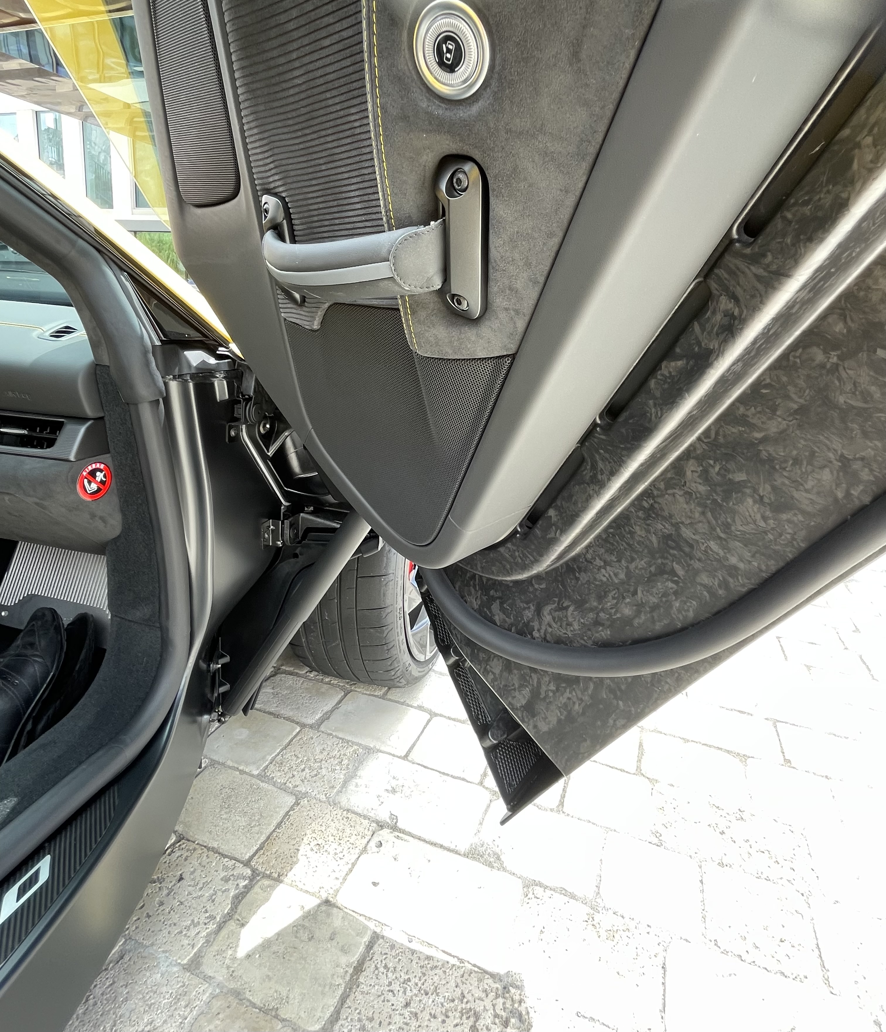 C’est ce gros vérin qui assure la propulsion vers le haut. Il n’y a pas de moteur électrique, c’est comme ouvrir et fermer un capot de malle. A la descente, il faut quand même bien claquer la porte. Plusieurs fois, nous l’avions mal fermée. C’est le bouton en haut de l’image qui permet de déverrouiller de l’intérieur la portière qui est légère car en carbone, garnie d’Alcantara vers l’habitacle. Remarquez le repose pied passager en aluminium. On note combien la coque centrale, en carbone, plonge vers l’intérieur à l’avant.