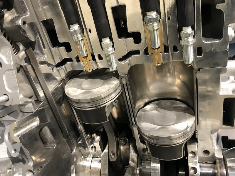 Le V6 semble très compact, très bas et très avancé vers l’habitacle. Voici ci-dessous des images de ce moteur V6 ouvert à 90 degrés, les deux turbos sont sur les côtés, tout cela comme sur nos vieilles Biturbo chéries de l’autre millénaire qui étaient vraiment prémonitoires ! Mais le fameux Y de l’arrivée vers la chambre d’admission après les échangeurs se fait par l’arrière. Il est symbolisé ci-dessous en jaune : Distribution par chaînes, variateurs d'arbres à cames sur l'admission et l'échappement, c'est une œuvre d'art, ce moteur : Mais le bouquet, c’est la préchambre de combustion, une technologie de Formule 1 appliquée pour la première fois sur une voiture de tourisme sur la Maserati MC20 ! Eh oui, avant Ferrari ! Deux bougies par cylindre, une latérale assurant la combustion normale, une centrale allumant une préchambre tubulaire en alliage doré : En usage tranquille, seule la bougie latérale s'allume. En moyenne et forte charge, la seconde bougie s'allume aussi en haut de cette petite colonne de 1 cm3 dans la pièce dorée. C'est cette colonne, la préchambre de combustion. Le mélange air-essence s'y enflamme et descend à vitesse énorme par trois sorties vers le cylindre (effet plasma) où il va entraîner une combustion hyper-complète et quasiment synchrone des gaz présents, gage de l'absence de cliquetis malgré un taux de compression à 11 : 1, valeur très élevée pour un moteur suralimenté. Notez la forme très travaillée du sommet du piston.