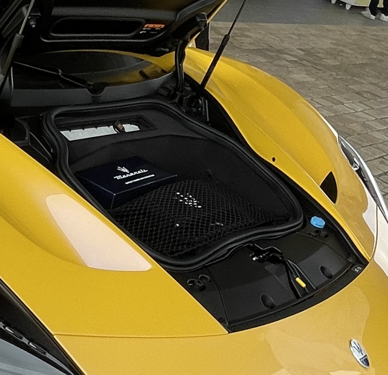 A l’avant un très petit coffre de 47 litres avec le pré-équipement pour brancher un maintient de charge qui est fourni (boite bleue siglée Maserati). Le bouchon bleu est celui du liquide lave-glace :