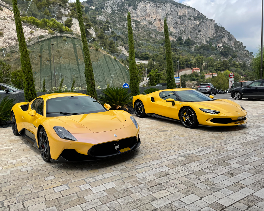 Tout est possible à Monaco quand il s’agit de nouveautés ! Hasard incroyable, voici l’arrivée de la réponse de Maranello à la MC20, en jaune aussi mais sans les portes en élytres de la Maserati ! C’est la Ferrari 296 GTB : V6 comme la MC20 mais ouvert à 120 degrés, Biturbo 2.9 litres mais hybride rechargeable.