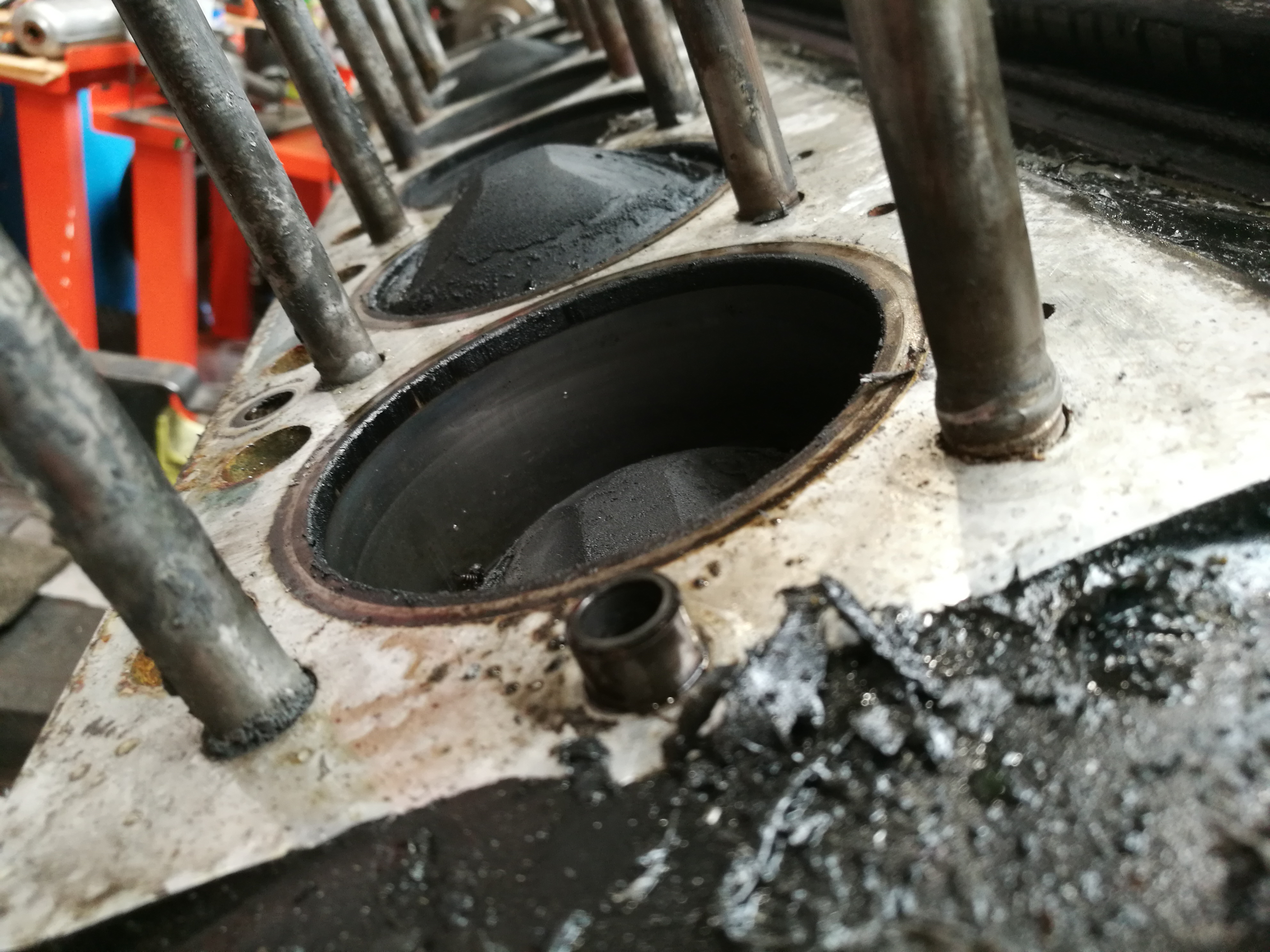Ici, l'état "décapé" des pourtours de certains pistons indique que du fluide de refroidissement rentrait dans les chambres