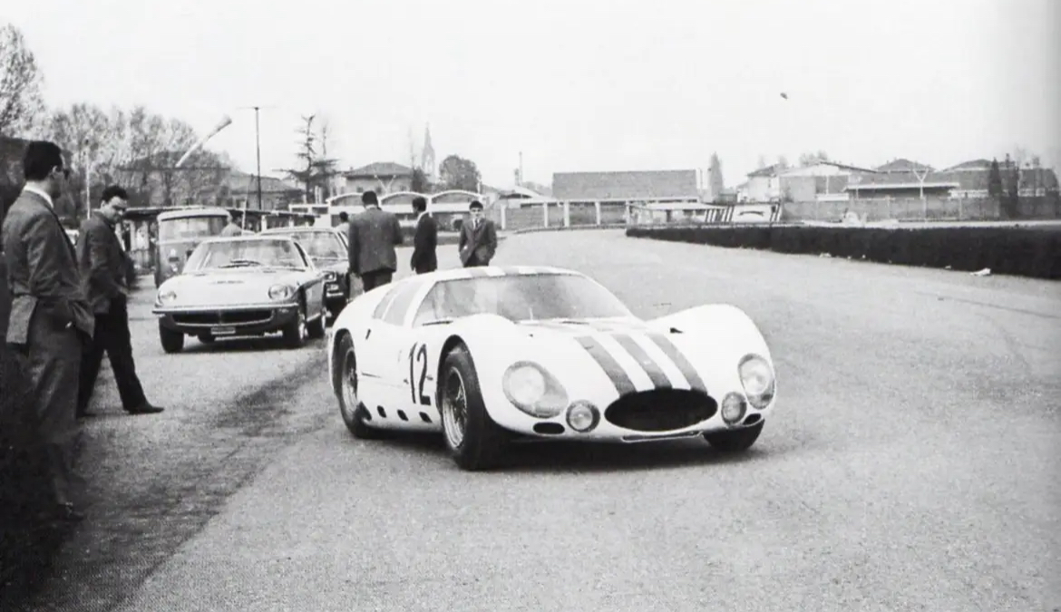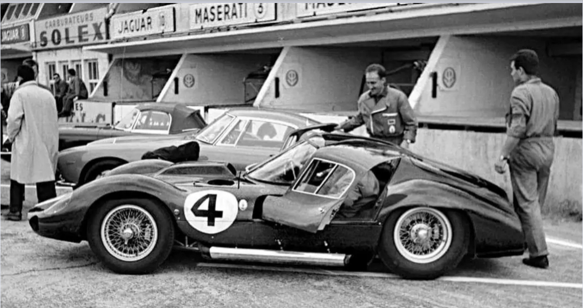 Sur la photo ci-dessous, prise lors des essais d'une Tipo 151 "Cunningham" à l'autodromo di Modena, on reconnait de la gauche à la droite Briggs Cunningham (point rouge), l'ingénieur Giampaolo Dallara qui était alors l'assistant de Giulio Alfieri (point bleu), Albert Momo le mythique chef mécanicien du team Cunningham (point jaune), John Simone (point vert), l'ingénieur Giulio Alfieri (point marron), Omer Orsi le directeur de Maserati (point mauve) :