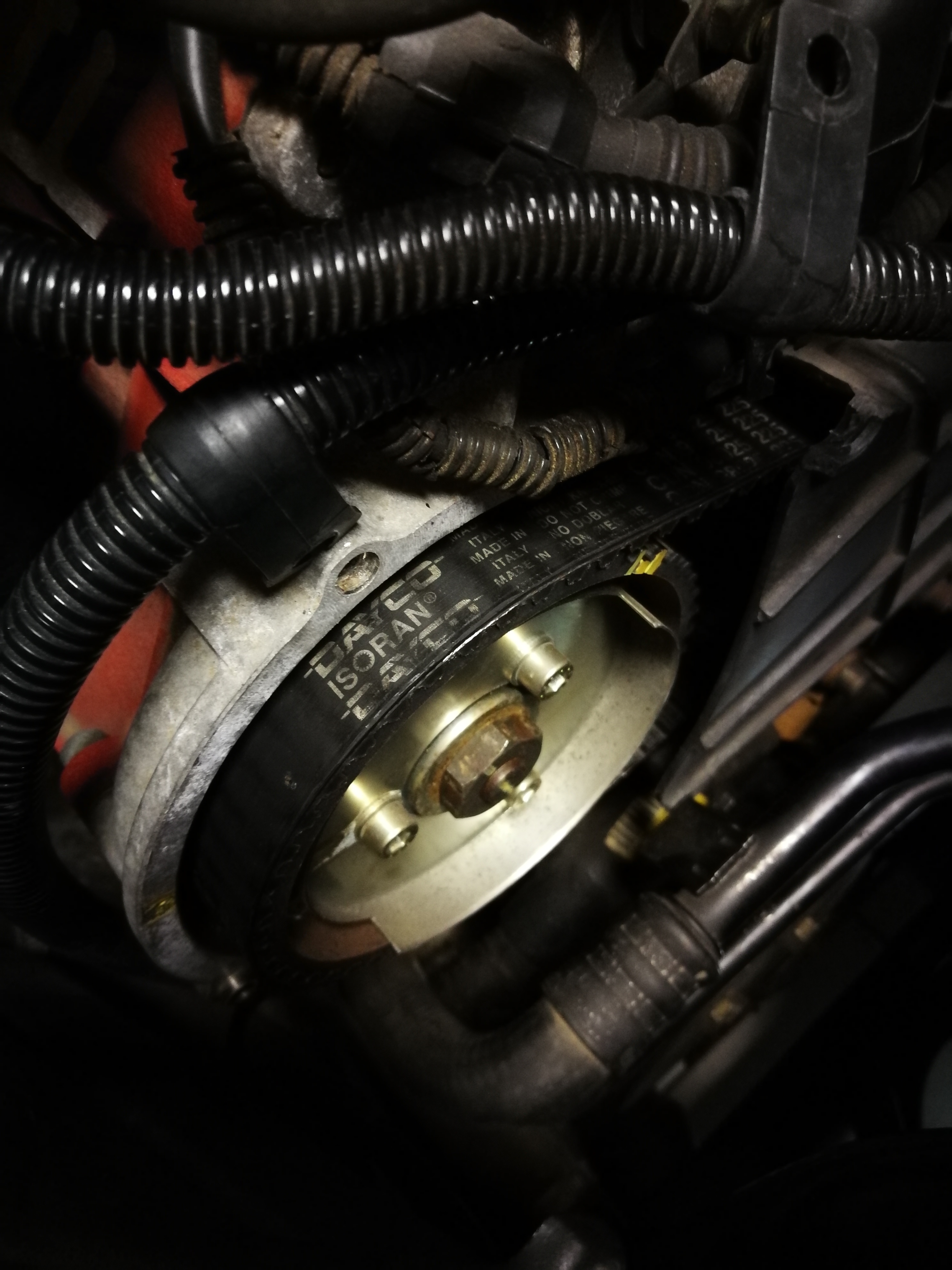 Progressivement, la courroie va tourner, entrainée par la poulie (si vous ne dévissez pas les bougies, ça va etre un peu dur vu la résistance du moteur, mais c'est jouable même avec une petite clef).