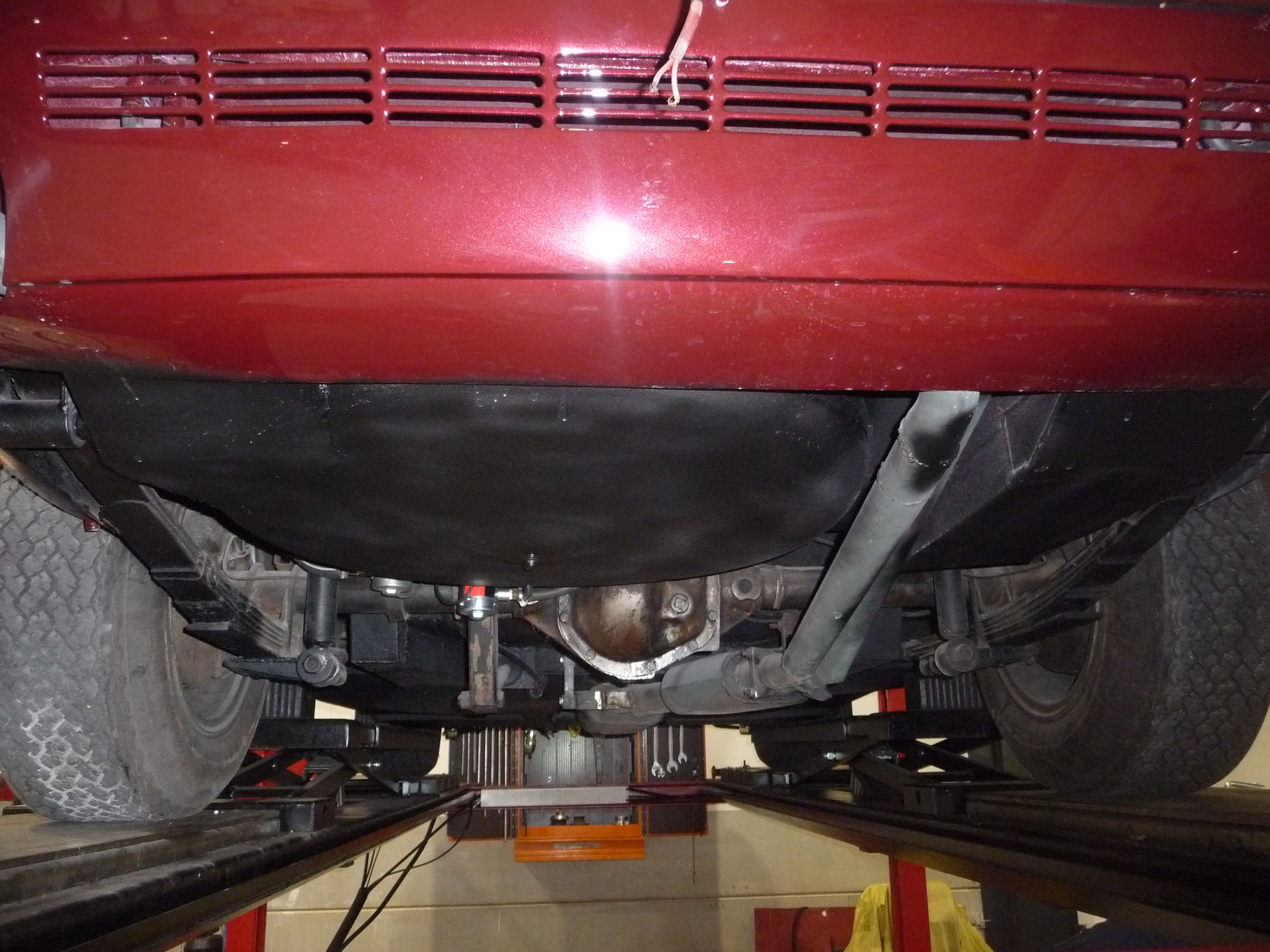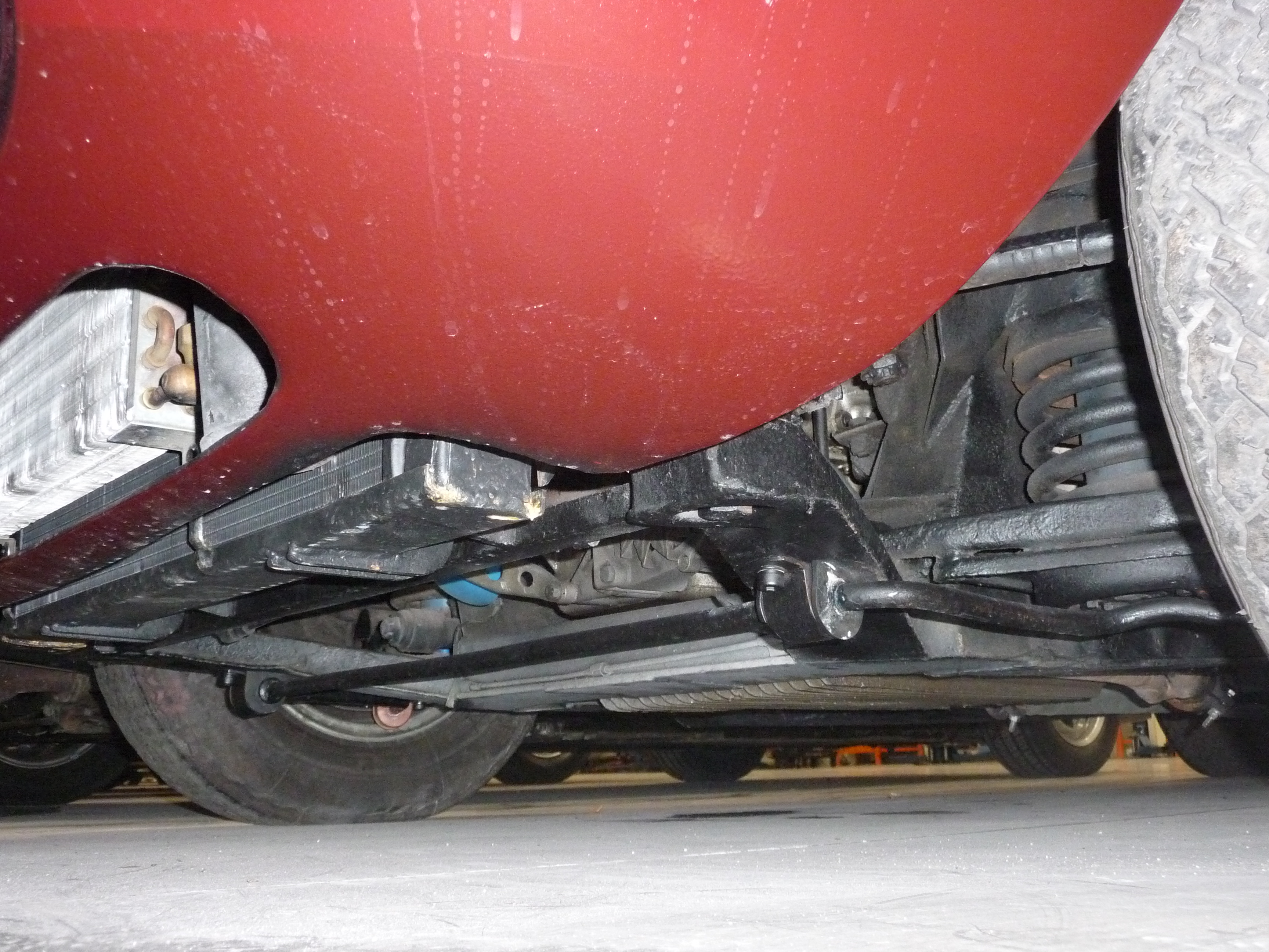 On devine ci-dessous, tout au fond derrière le rehausseur (il faut agrandir pour voir), que les fixations de la barre stab AV sont à l'aplomb des rampes du pont, ce qui rend difficile de travailler dessus si on n'a pas suffisamment d'espace: