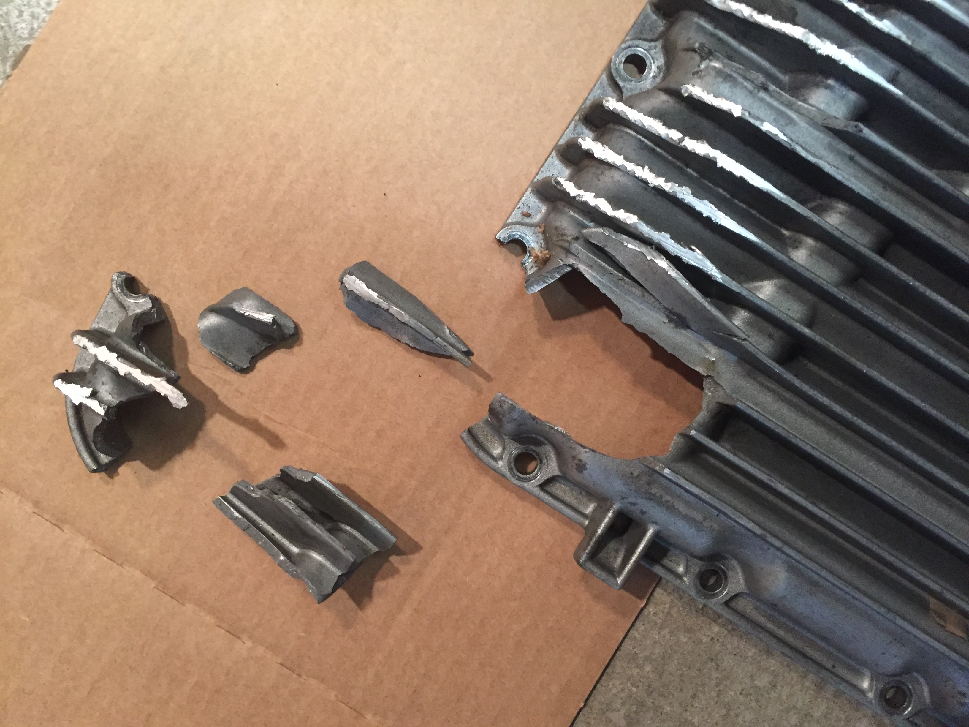 Sur la photo ci-dessous, on peut aussi remarquer (en dehors des fuites d'huile) deux types de fractures: l'une avec déformation et déchirure du métal (au fond à droite, vers le filtre à huile), l'autre fragile avec casse nette (plus en arrière).