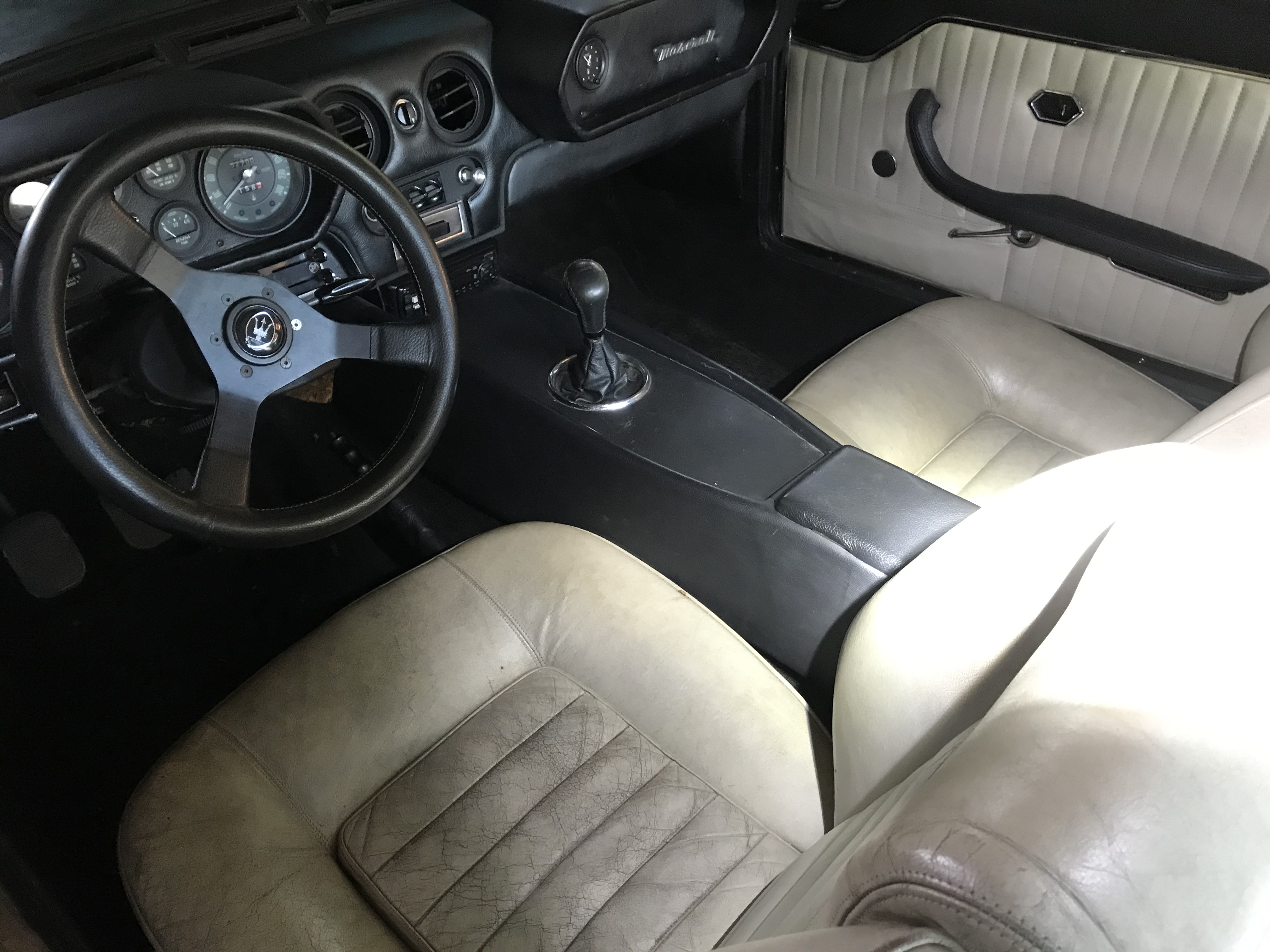 à l'avant les cuirs sont un peu sales mais de bonne qualité; un bon nettoyage au savon special cuir et ça devrait aller à l'arrière...il manquait les sièges heureusement un interieur complet trouvé en Seine et Marne; il va falloir que je les refasse avec un cuir identique à l'avant , mais la sellerie c'est ma passion... coté moteur, une fois la batterie changée... démarrage impeccable, sauf une forte odeur d'essence; une durite fissurée, vite changée et tout va bien ; mais il va falloir que je fasse le tour complet du circuit d'essence pour tout verifier