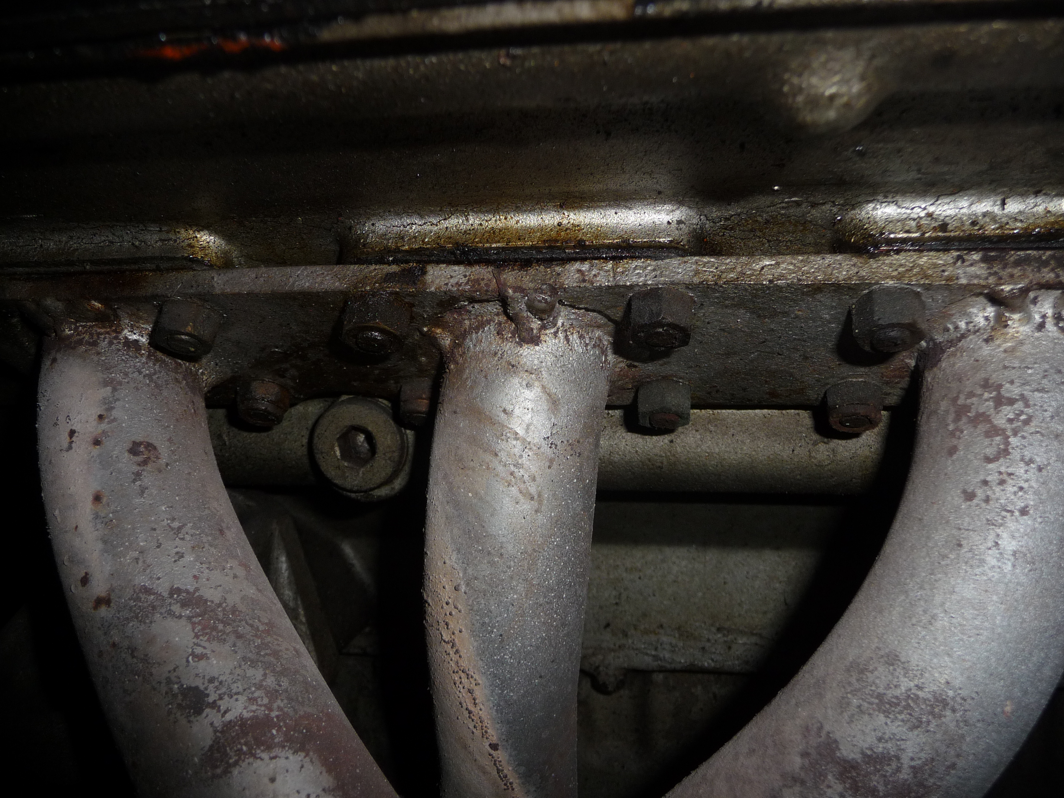Le collecteur gauche de mon Indy a apparemment fait l'objet d'une réparation, avec nouvelles soudures au niveau des cordons de soudure originaux des tubes sur la barre fixée au bloc: