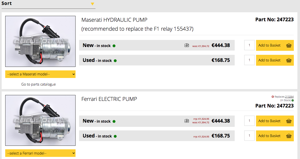 La pompe, c'est malheureusement l'ancien prix maserati officiel (il est noté en toujours noté en tout petit en rouge chez eurospares, rrp 1524€), mais à 444HTVA, c'est aussi l'officielle, avec la boite avec trident (ou cheval cabré), mais j'imagine que la concession ne se fournit pas chez eurospares.