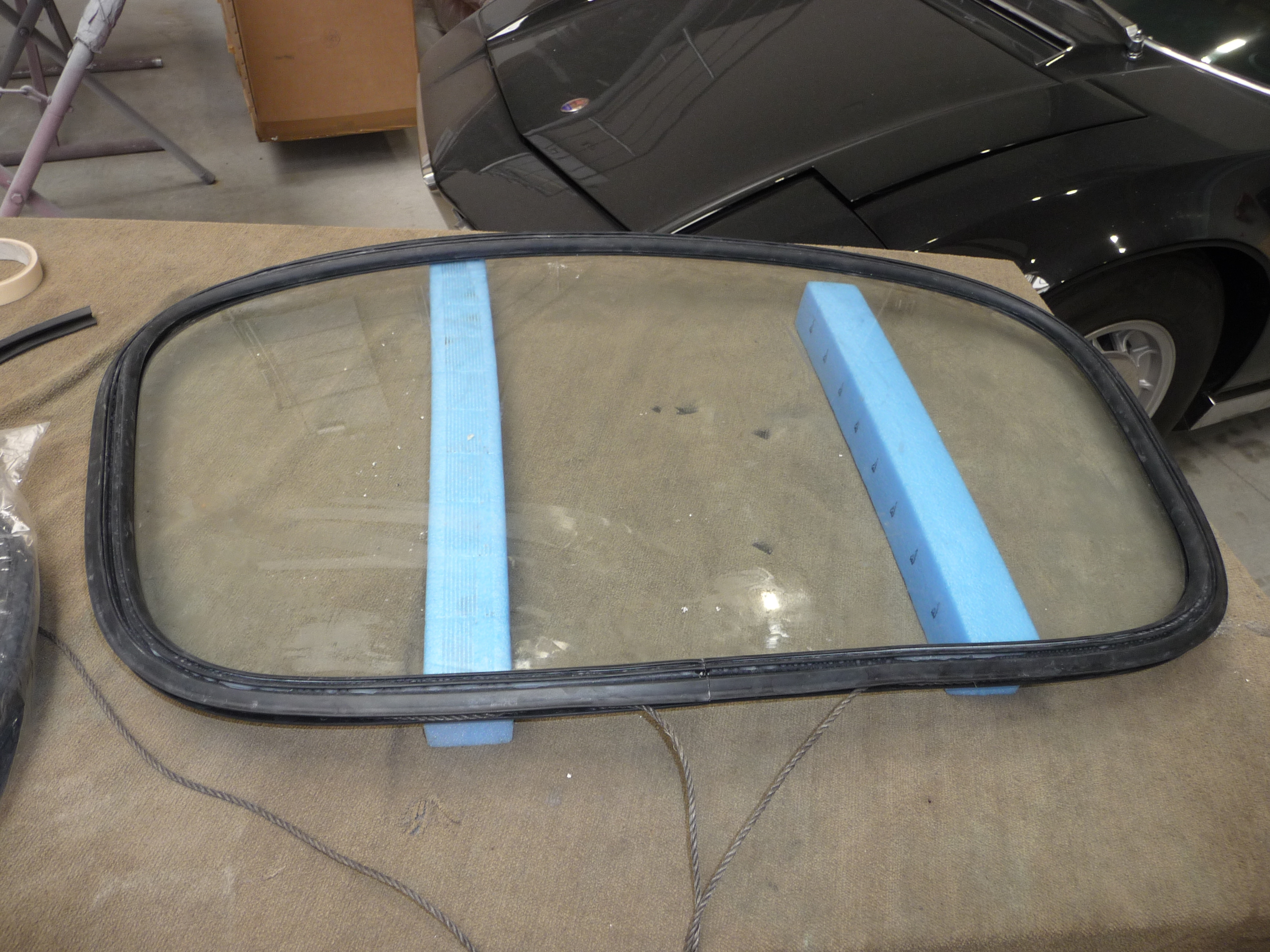 J'ai aussi apporté les joints des vitrages du parebrise et du hayon AR, ainsi que les deux panneaux préfabriqués recouverts de vinyle qui habillent l'intérieur du hayon. Il faut en effet d'abord poser ces panneaux car le vinyle doit être inséré/collé autour de la tôle de bord sous le joint caoutchouc du bord de vitrage.