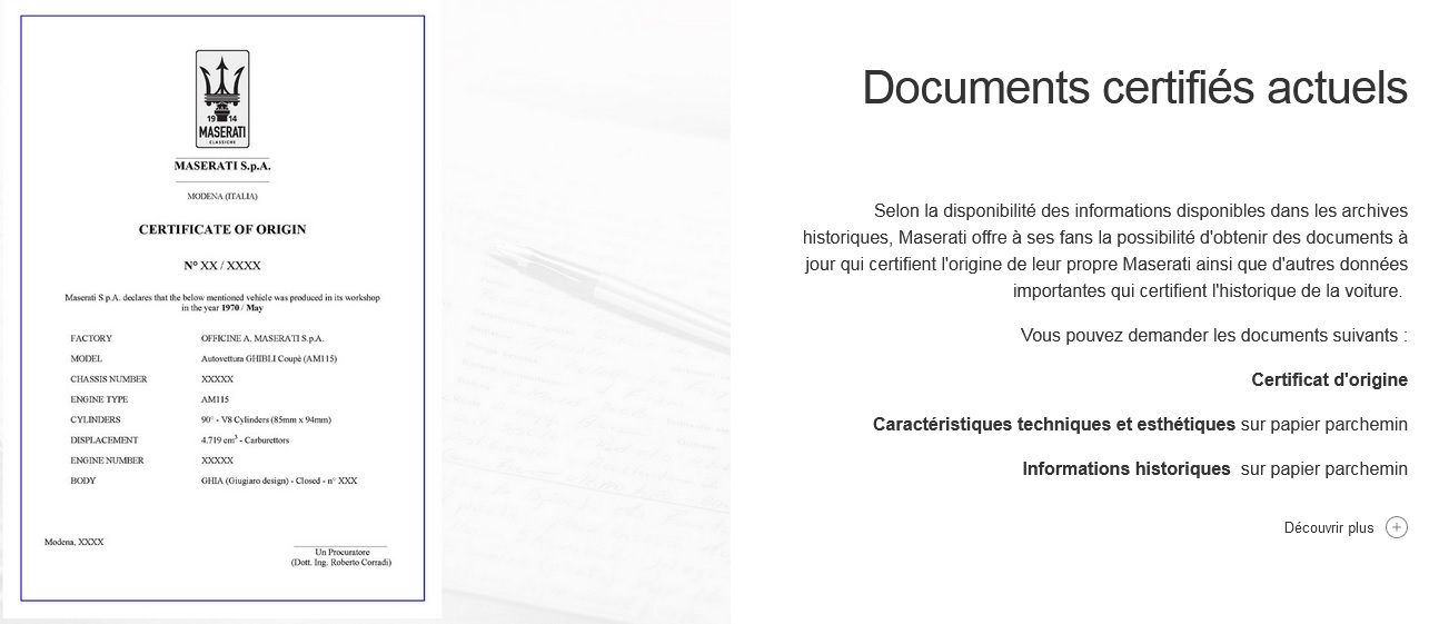 Mmmm....je pense que l’intérêt, vu les prix annoncés est variable. En effet on hésitera pas à payer 2000 balles pour se faire certifier une Ghibli Spyder dont on a pas vraiment l’historique après 10 propriétaires. Pour ma Ghibli 2 dont j’ai été l’unique propriétaire, qui a 40 k. bornes et dont pas une vis n’est pas d’origine, et dont la valeur est modeste, un peu cher quand même, je pense que le traçage de Fabio suffira,