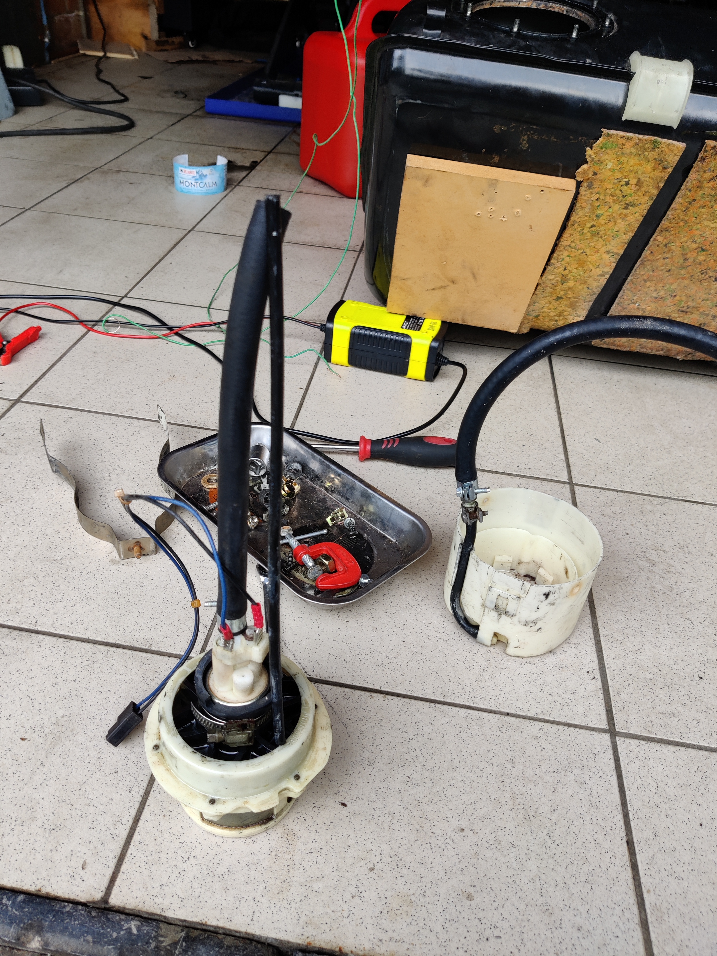 Notre hypothèse est donc que de l'air se forme sous la pompe, car elle aspire toute l'essence qu'il y a autour. Il y a trois petits trous à la base du bol qui permettent à l'essence de rentrer, mais par rapport au débit de la pompe, surtout vu qu'ils sont collés au fond (à tous les coups, il y avait un spacer pour limiter ce problème qui s'est désagrégé), ça ne suffit probablement pas, et donc la pompe aspire l'air via la paille. Je ne vois pas d'autre solution.