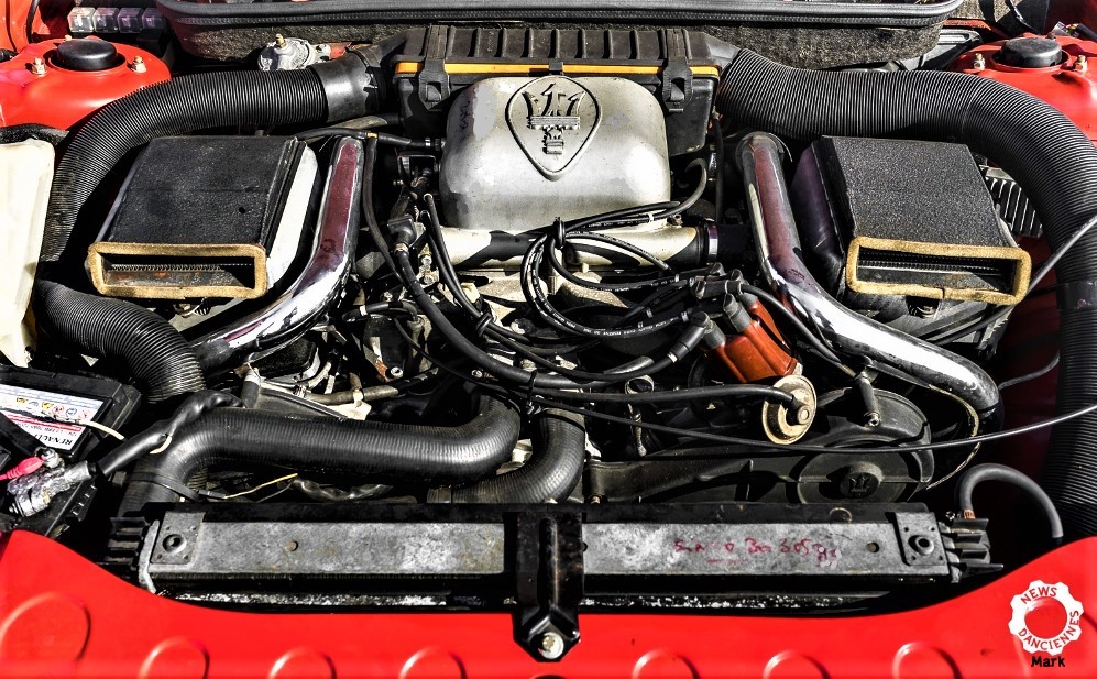 On voit sur le capot de la Biturbo S les prises d’air Naca qui alimentent les deux échangeurs air-air permettant de refroidir l’air admis dans le moteur. Ça réglait aussi un problème qui était celui du "vapor-lock" : quand le moteur était chaud et qu’on coupait le contact, parfois l’essence s'évaporait sous la cloche et on ne pouvait plus redémarrer à chaud, il fallait attendre une demi-heure que le moteur refroidisse. Avec les échangeurs, ce problème a disparu. La Biturbo S développe 205 cv pour 1095 kg (+11 kg par rapport à la Biturbo).