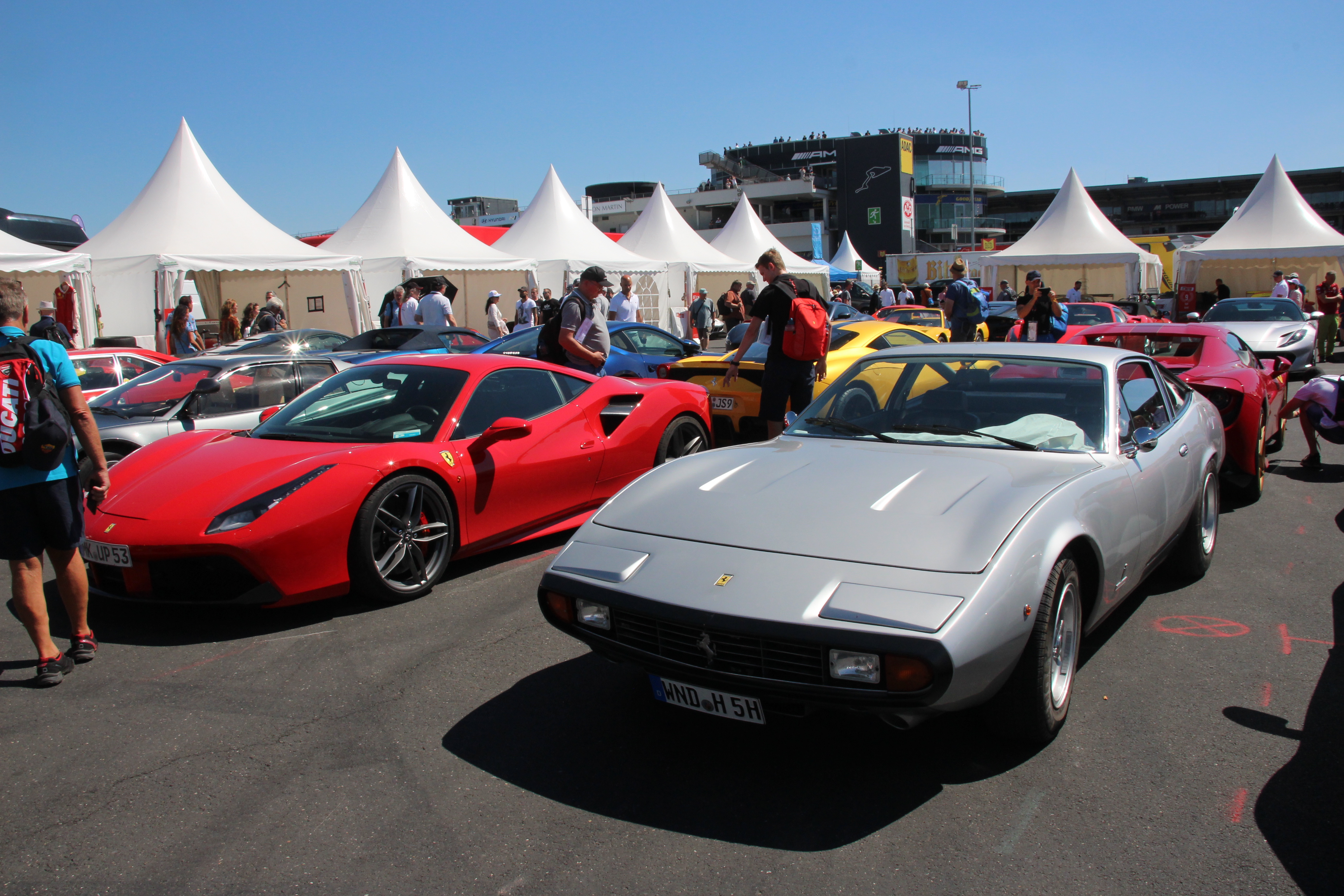 Seuls les deux derniers étaient là, beaucoup de modernes pour Ferrari, heureusement beaucoup de classiques sur le parking du