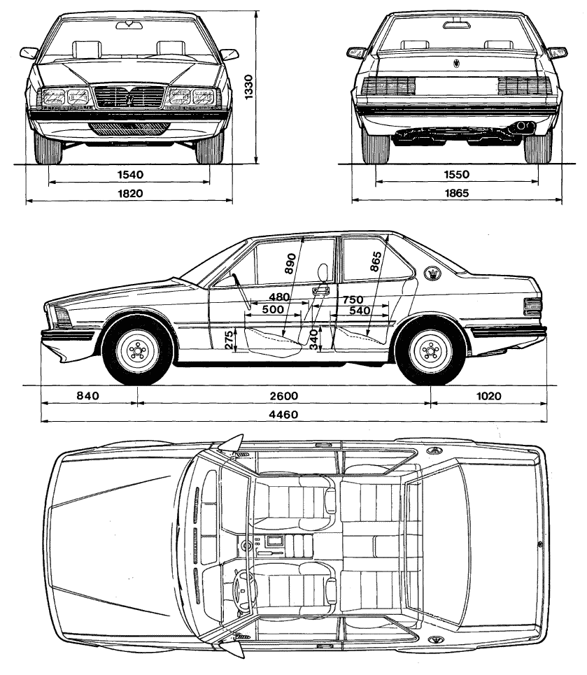 La 228 mesure 1.82 mètres de large (+ 12 cm par rapport à la Biturbo) et 4.46 mètres de long (+ 29 cm par rapport à la Biturbo). L’empatement de la 228 est celui de la berline 425 présentée en décembre 1983 (2.60 mètres soit + 9 cm par rapport au coupé Biturbo) :