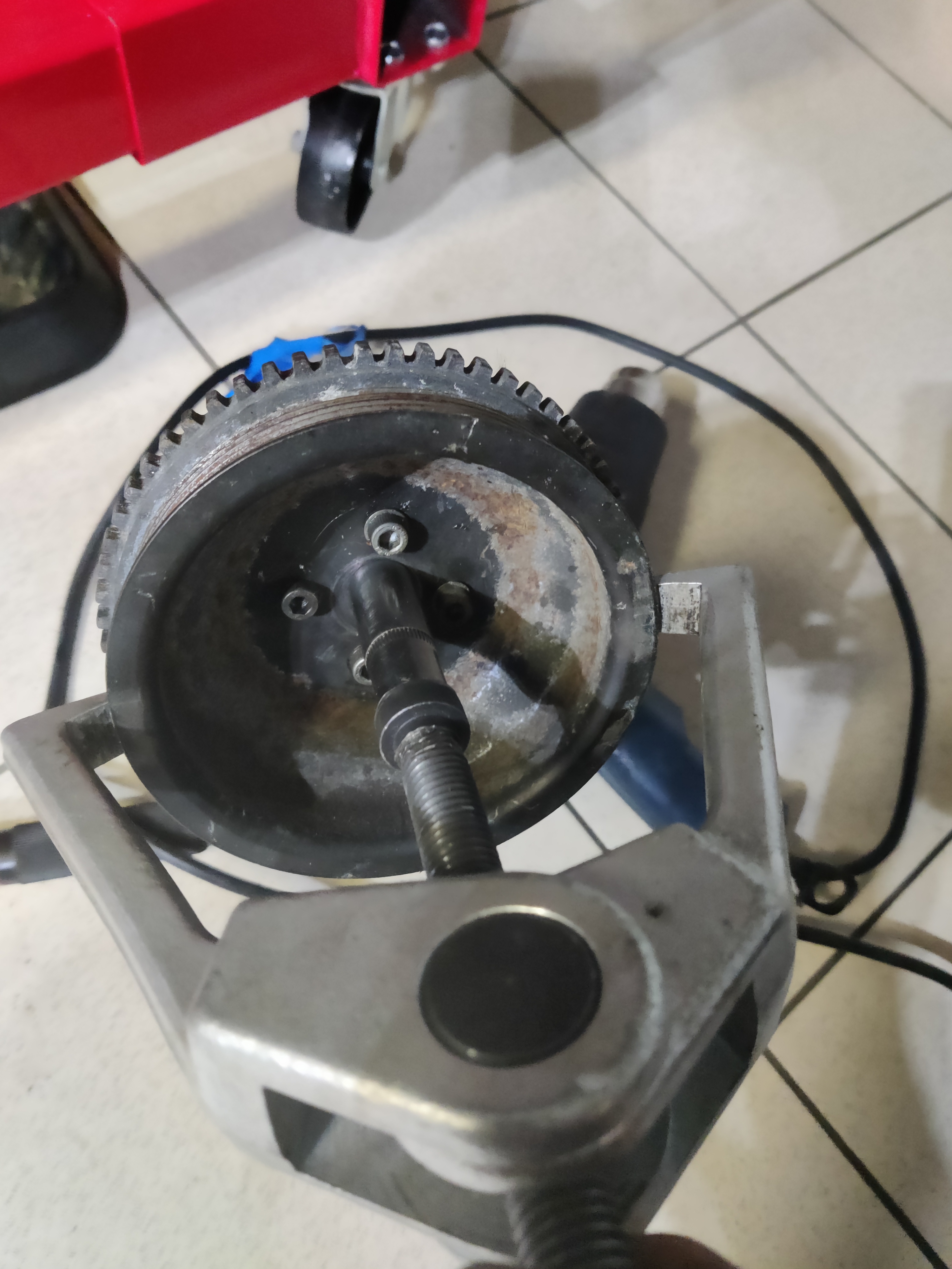 Donc on détache la boite (facile, 6 ou 7 écrous à 6 pans, dont 3 pour tenir le démarreur en place). un petit coup de pied de biche, et hop, ça se déboite.