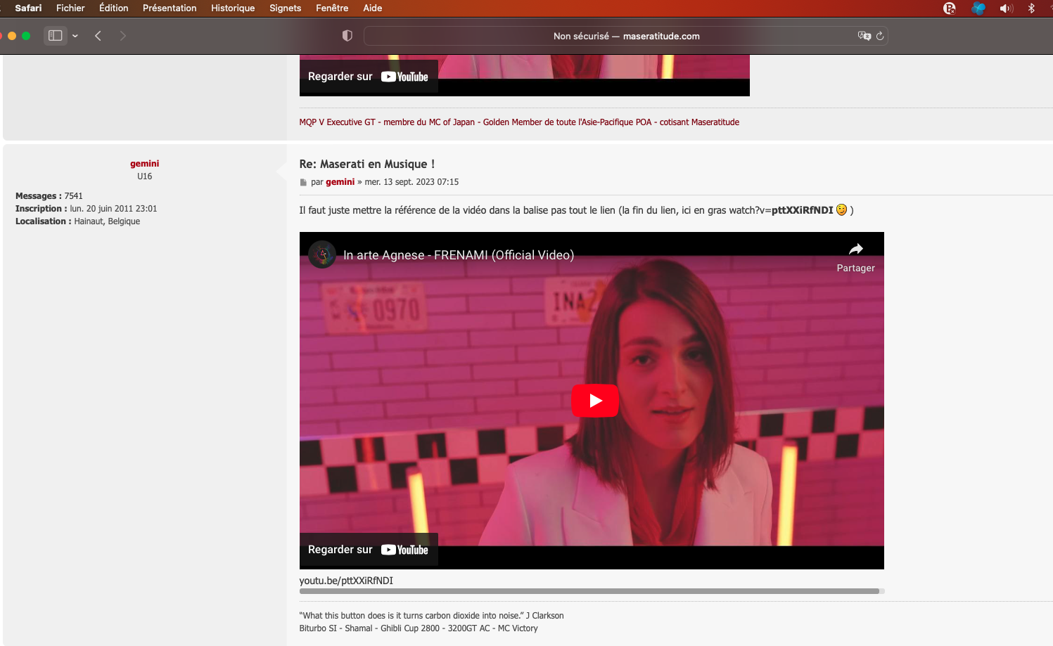 Malheureusement à l'inverse la balise Youtube de phpBB est à nouveau mal configurée suite à la récente mise à jour du site Maseratitude, et n'affiche rien sur Safari 16.6 / MacOS= on est revenu à la situation d'il y a 3 ans....