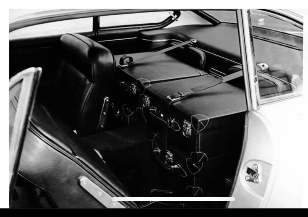 On a pas mal de photos d’époque de la 5000 GT Ghia. Mais cette photo de son intérieur avec bagages est plus rare :