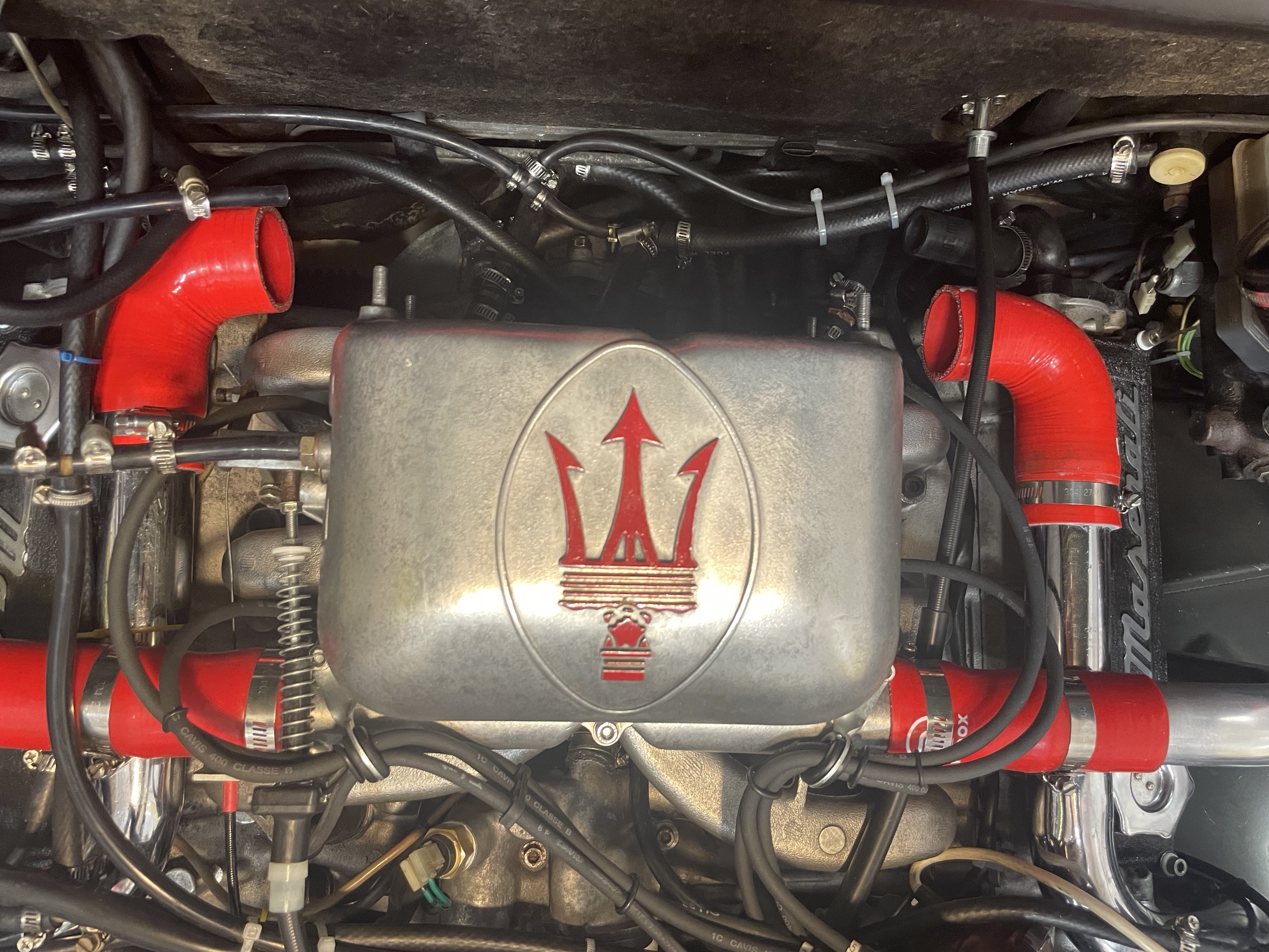 - Vue générale du moteur de la Biturbo 18V en 2l de 1984 avant de démonter le carburateur Weber.