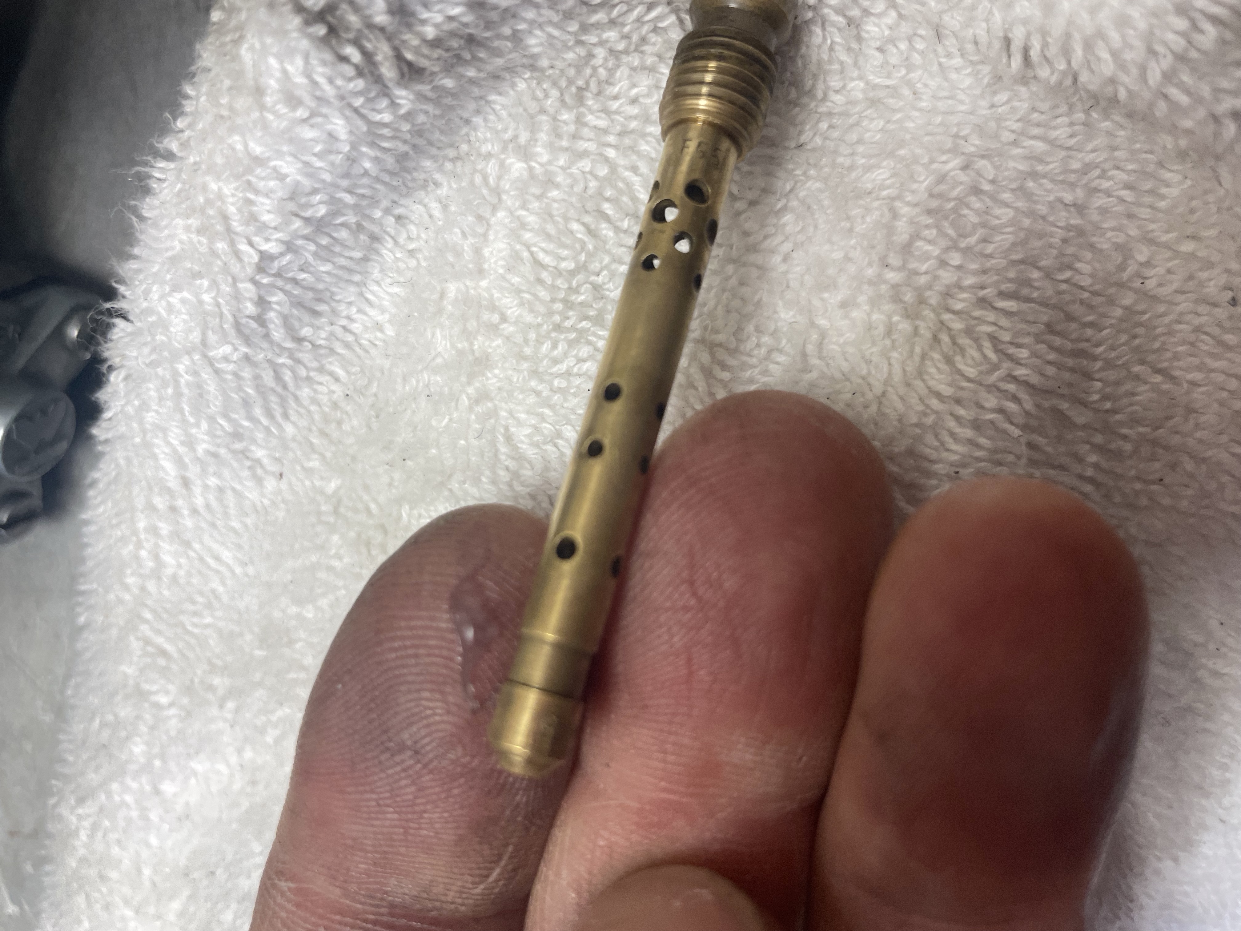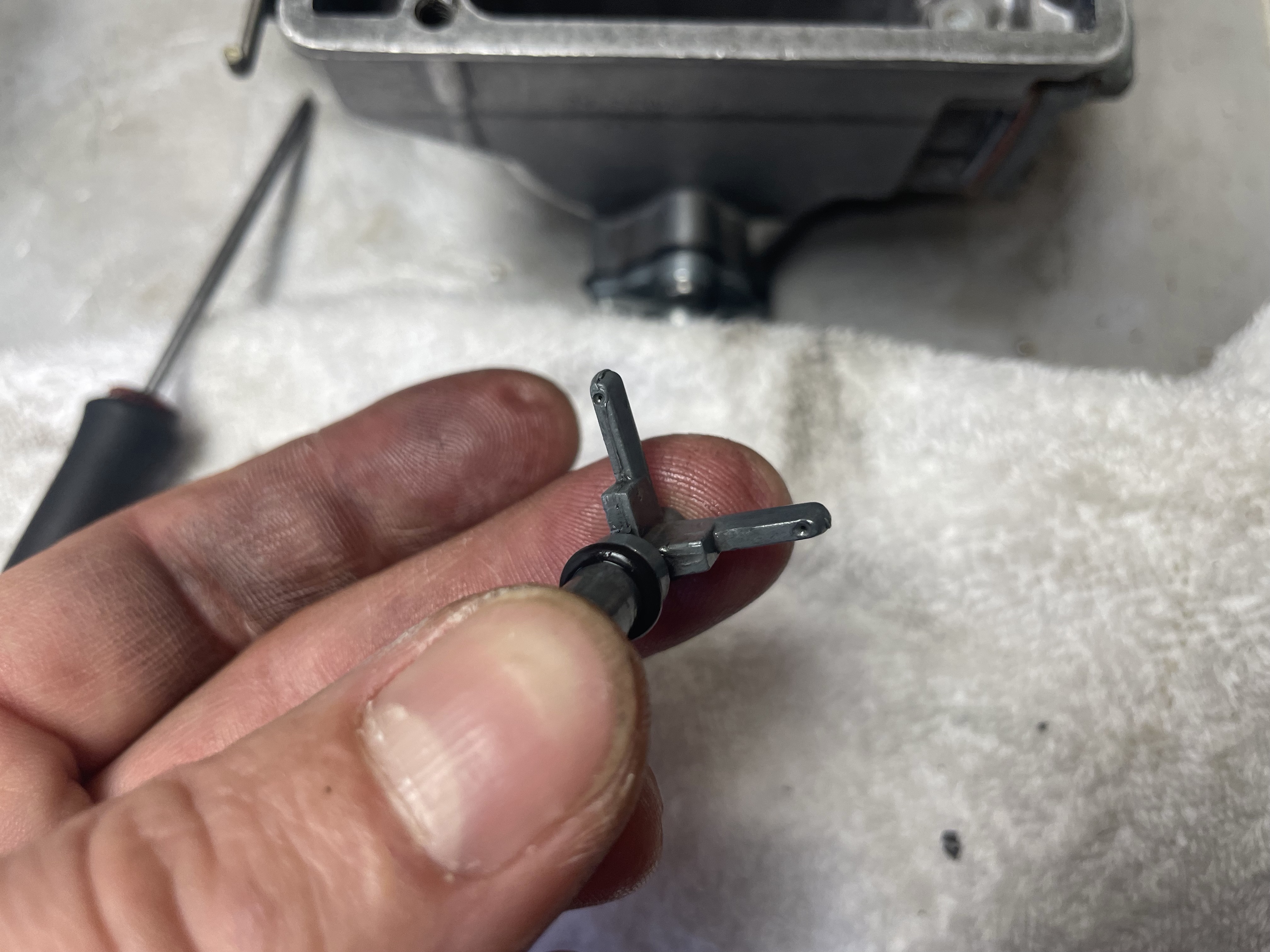 Sur mon modèle il faut 42.5mm. Pour la mesure il faut que le corps du carbu soit parfaitement à la verticale (un smartphone fait très bien le job de niveau numérique), et que la patte du flotteur se repose délicatement sur la bille du pointeau. je me suis amusé à souffler très doucement dans une durite branchée à l'entrée d'essence pour sentir la moindre restriction. Avant de toucher quoique ce soit il faut démonter et nettoyer le pointeau et le filtre sous l'énorme écrou de 19. Attention en desserrant l'écrou, je pense que mon support de flotteur d'origine avait été cassé par un coup de clé d'un mécano bien bourrin! Pour le flotteur, une petite pige permet de sortir son axe en poussant de l'intérieur vers l'extérieur.
