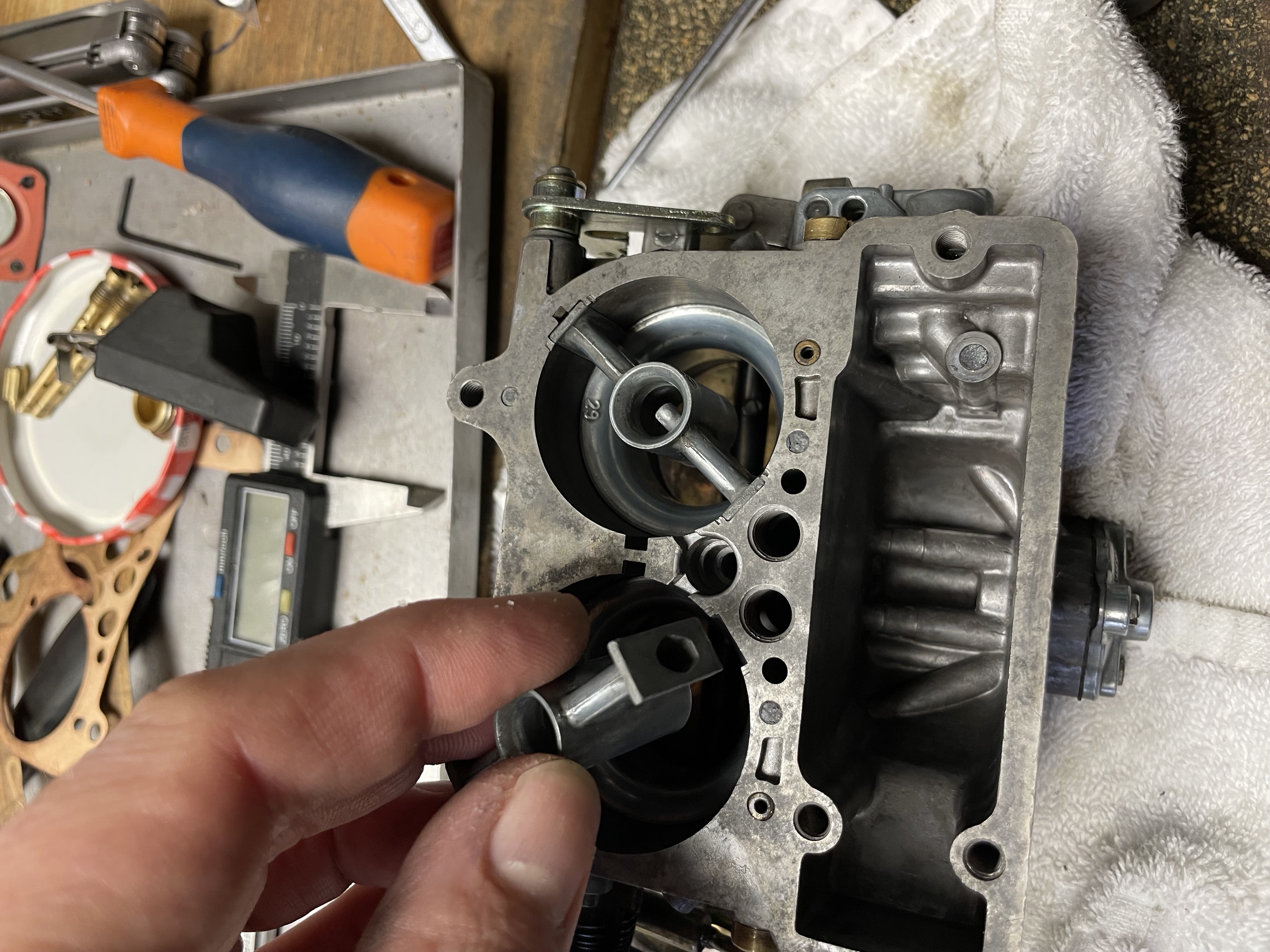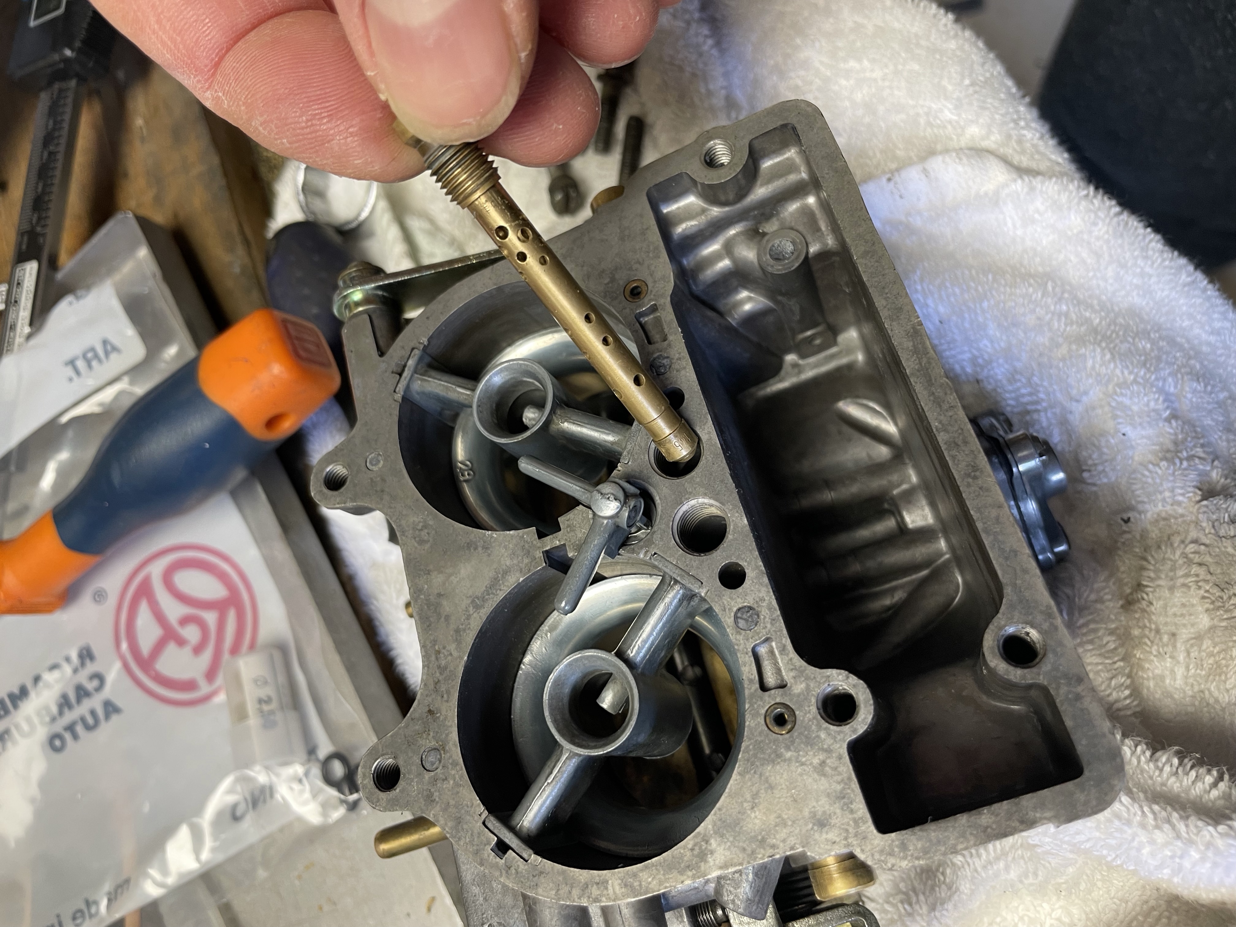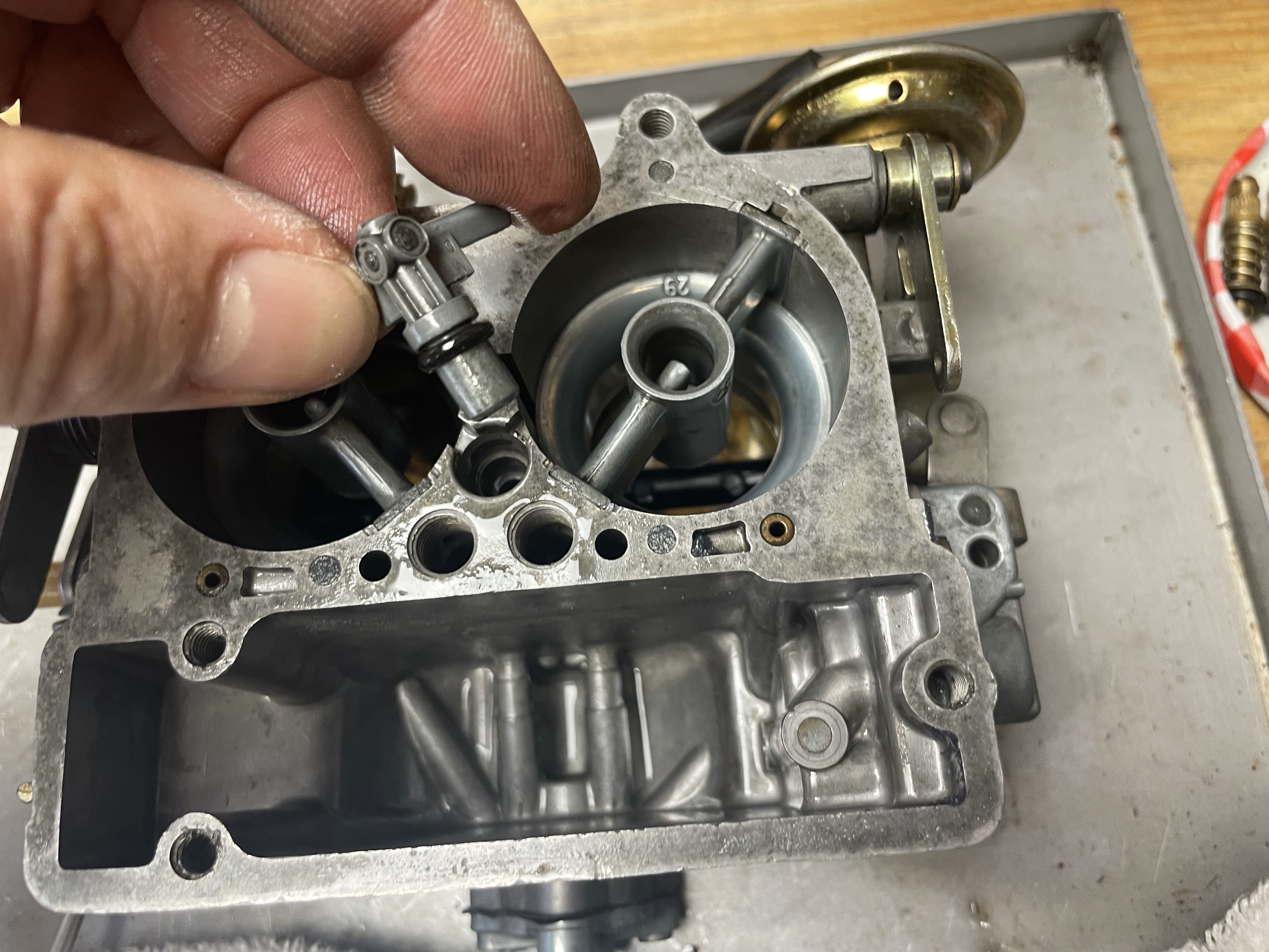 - Il faut ensuite démonter tous les gicleurs, soit en les dévissant avec un tournevis plat, soit en tirant directement à la main le gicleur d'accélération au centre maintenu par son petit joint torique (à changer également). Les boisseaux de 29 sur mon modèle 16-100 sortent aussi naturellement à la main.