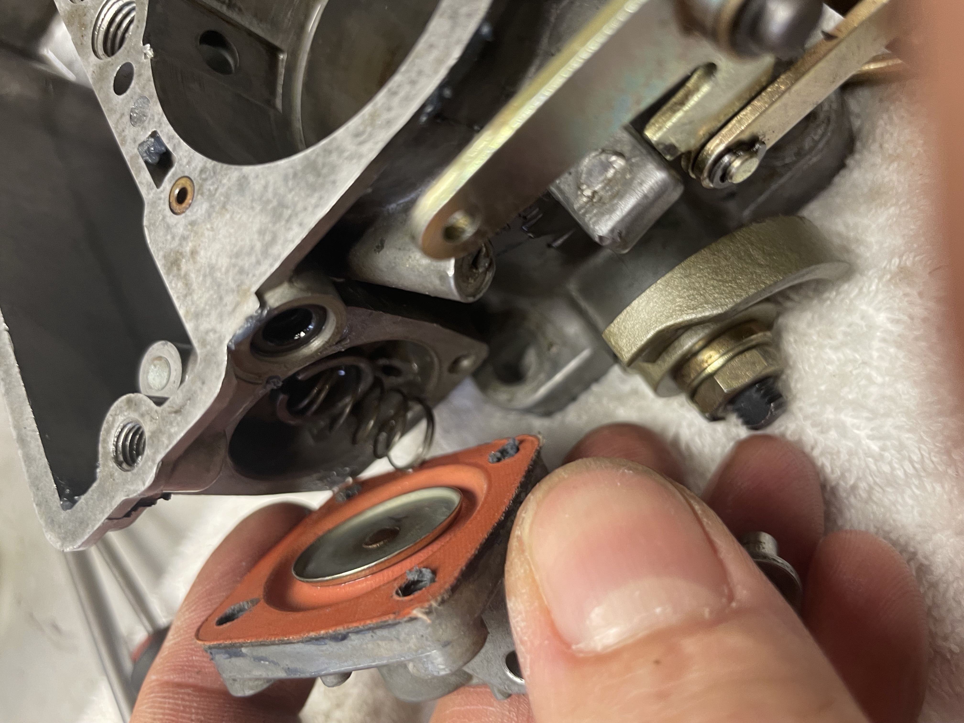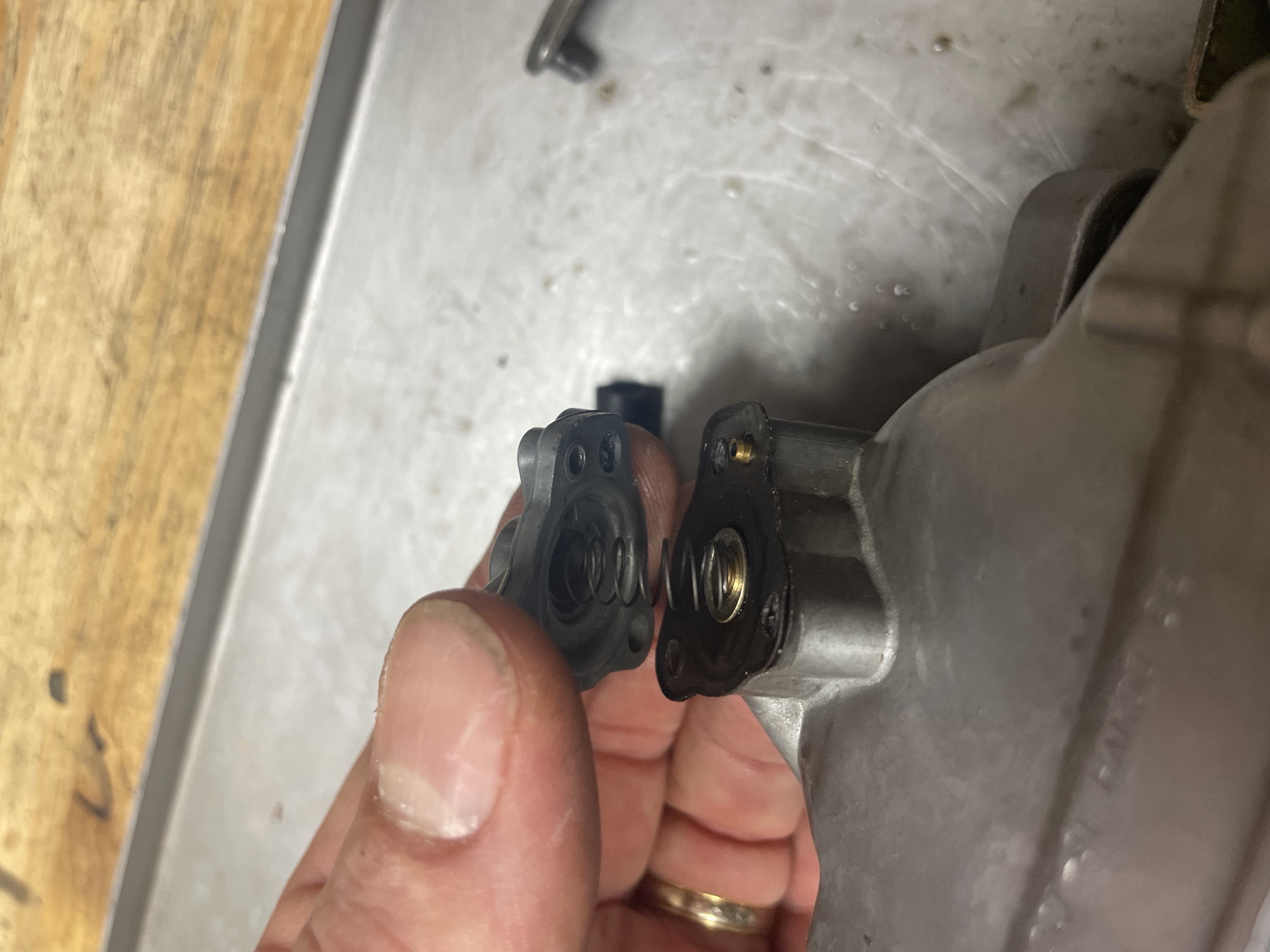 - Démonter les deux membranes en observant bien l'emplacement des ressorts, l'un en interne du carburant, l'autre en externe de la membrane.- Sur le mien, derrière la petite membrane à l'avant du carbu (celle à 3 vis) le support de la vis retenant la petite et son ressort a été forcé... comme la bille fonctionne très bien et n'est pas du tout bloquée, je ne l'ai pas démonté au risque d'aggraver le sujet. De toutes manières, c'est surtout la membrane qui s'use, la bille a peu de risque de s'abîmer.