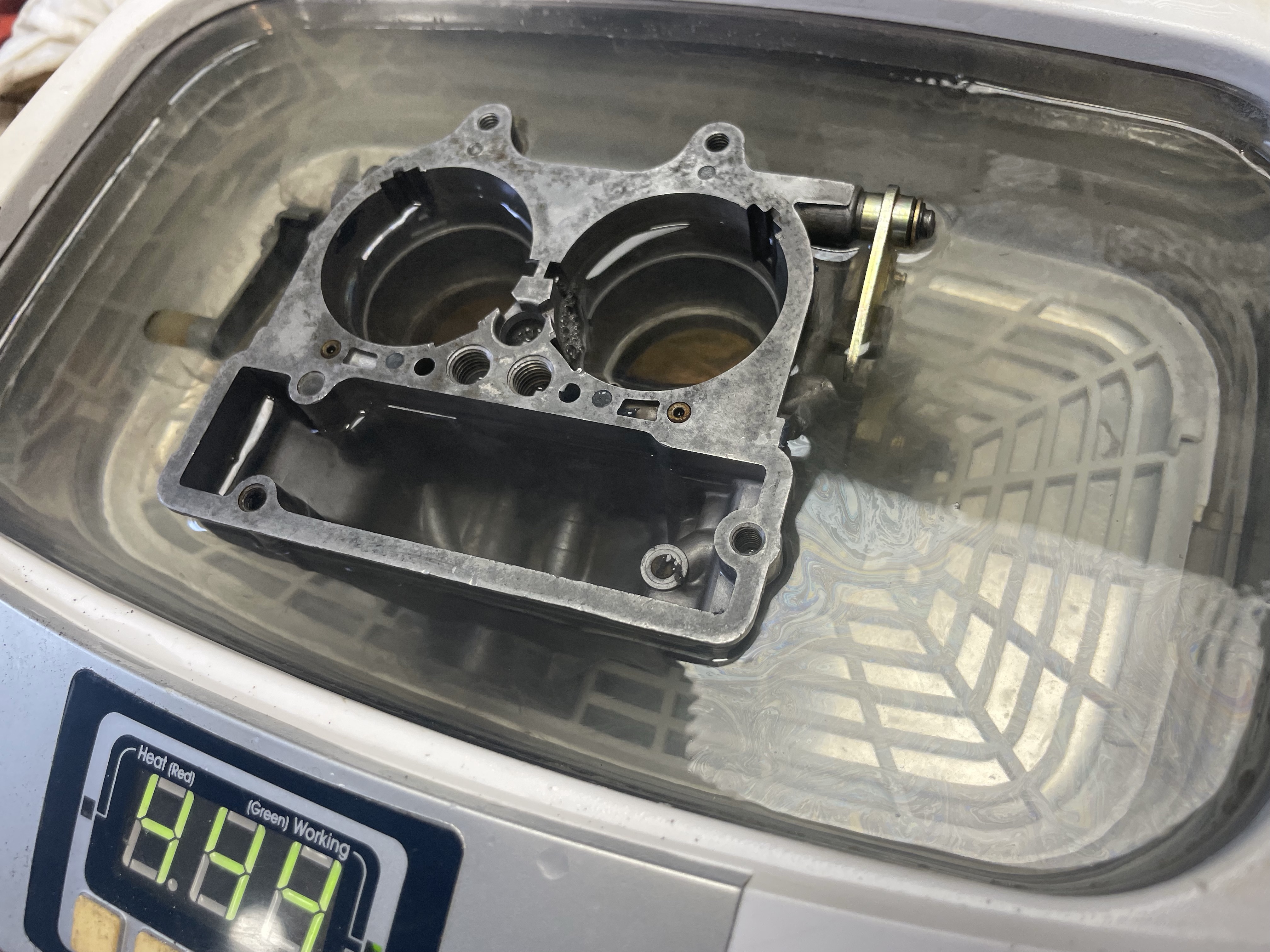 - Démonter la membrane de dépression pour le rappel des volets de starter, et ensuite mettre tout le corps du carbu, les gicleurs, et visserie métal dans un bon bain chaud à ultrasons avec 20% de VIGOR. Malgré un nettoyage assez soigné il y a quelques mois et à peine une 100ene de Km parcourus, l'eau était totalement noire à la fin! A chaque sortie de pièces, un grand coup de soufflette au compresseur pour dégager toutes les canalisations de l'eau et évacuer les particules de crasse. Le corps du carbu a passé 2x15 min dans le bain.