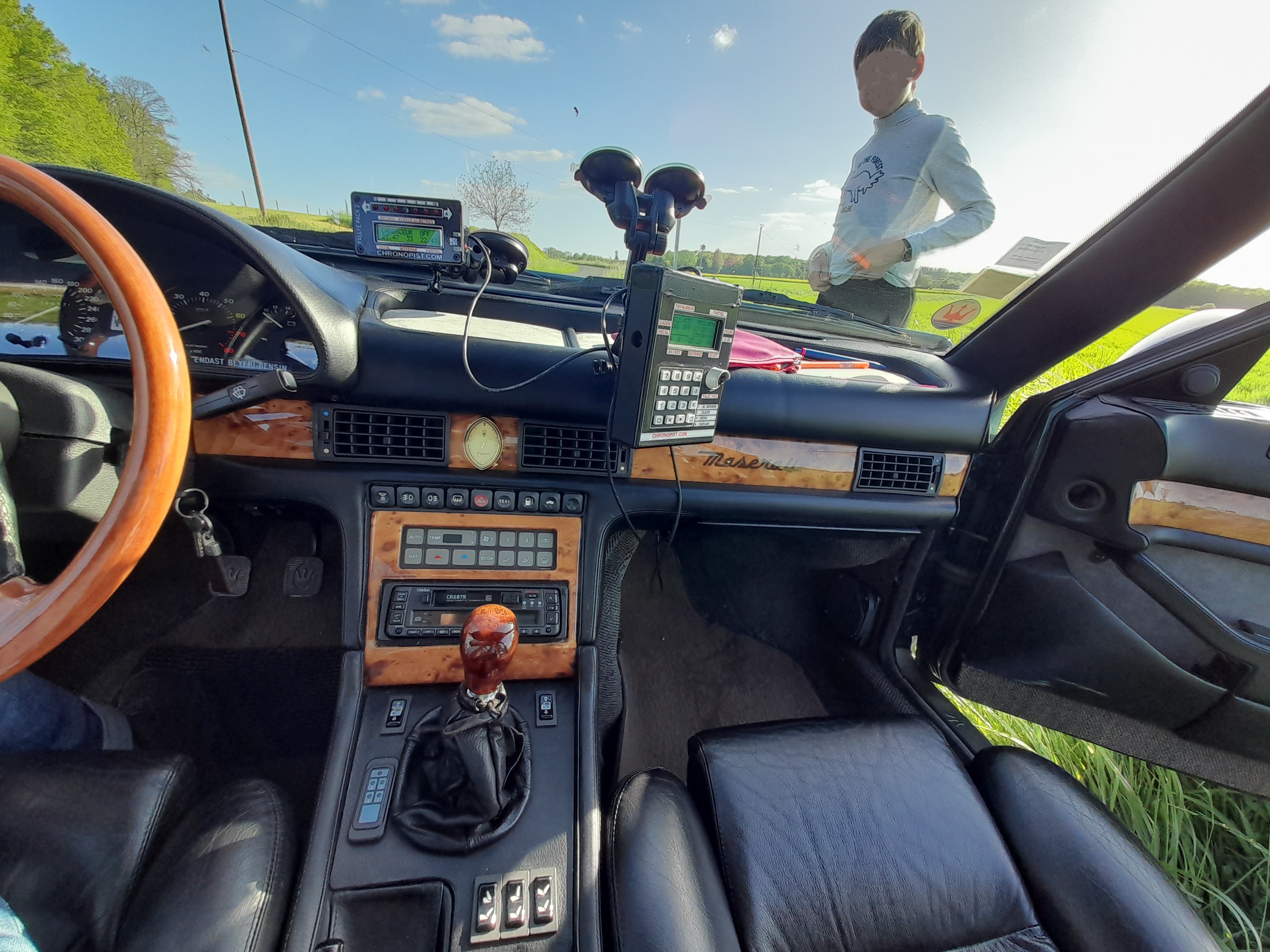 Il y a déjà un câble qui rentre dans l’habitacle à ce niveau-là sous les sièges arrière, je profite du passage. Une fois le matériel installé, ca donne ça. Evidemment rien de fixe, tout est monté sur ventouses et démontable. Désormais, la 430 nous servira pour les rallyes un peu loin de chez nous, et va seconder la vaillante Simca 1100 que nous utilisons depuis 8 ans.