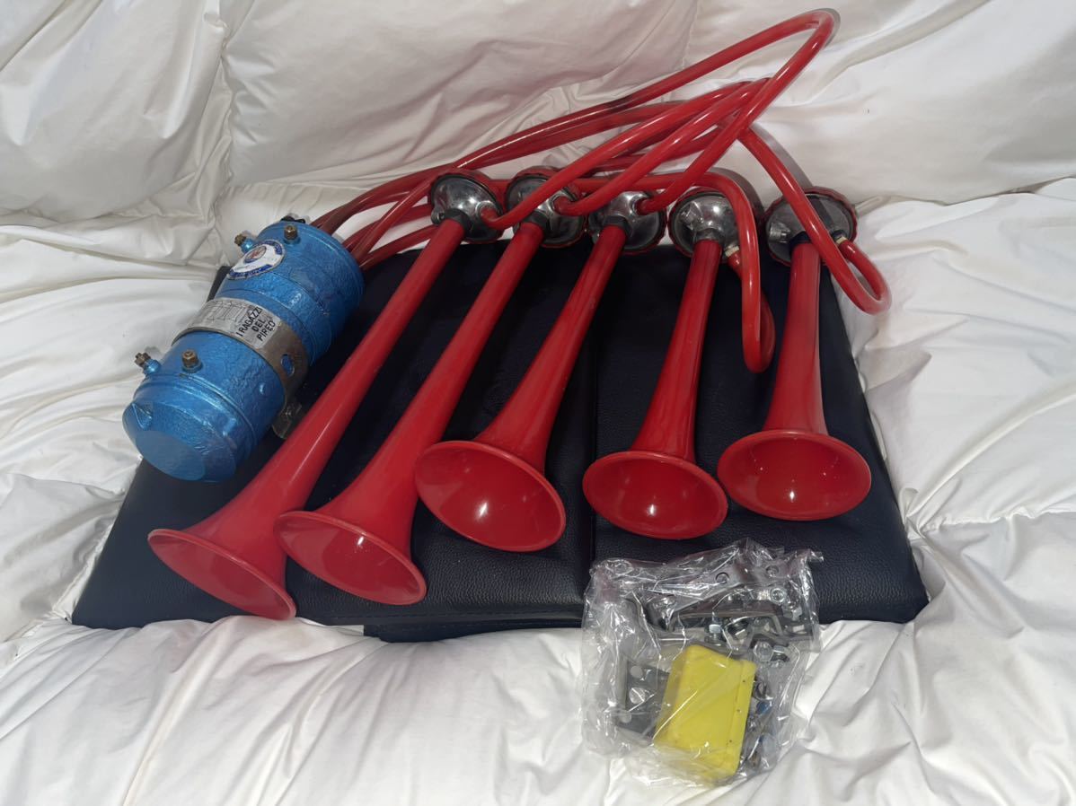 L'appui sur le volant ne provoquant qu'un bien disgracieux et faiblard "Greuuuuuu", j'ai investigué un peu et découvert que c'était le compresseur qui produisait ce bruit. En le testant sur l'établi, il tourne et il souffle, mais pas assez pour sortir un son aux trompes. Je l'ai démonté pour voir, rien identifié de particulier. Soit les 3 palettes du compresseur ne font plus le boulot, soit le moteur ne tourne plus assez vite...