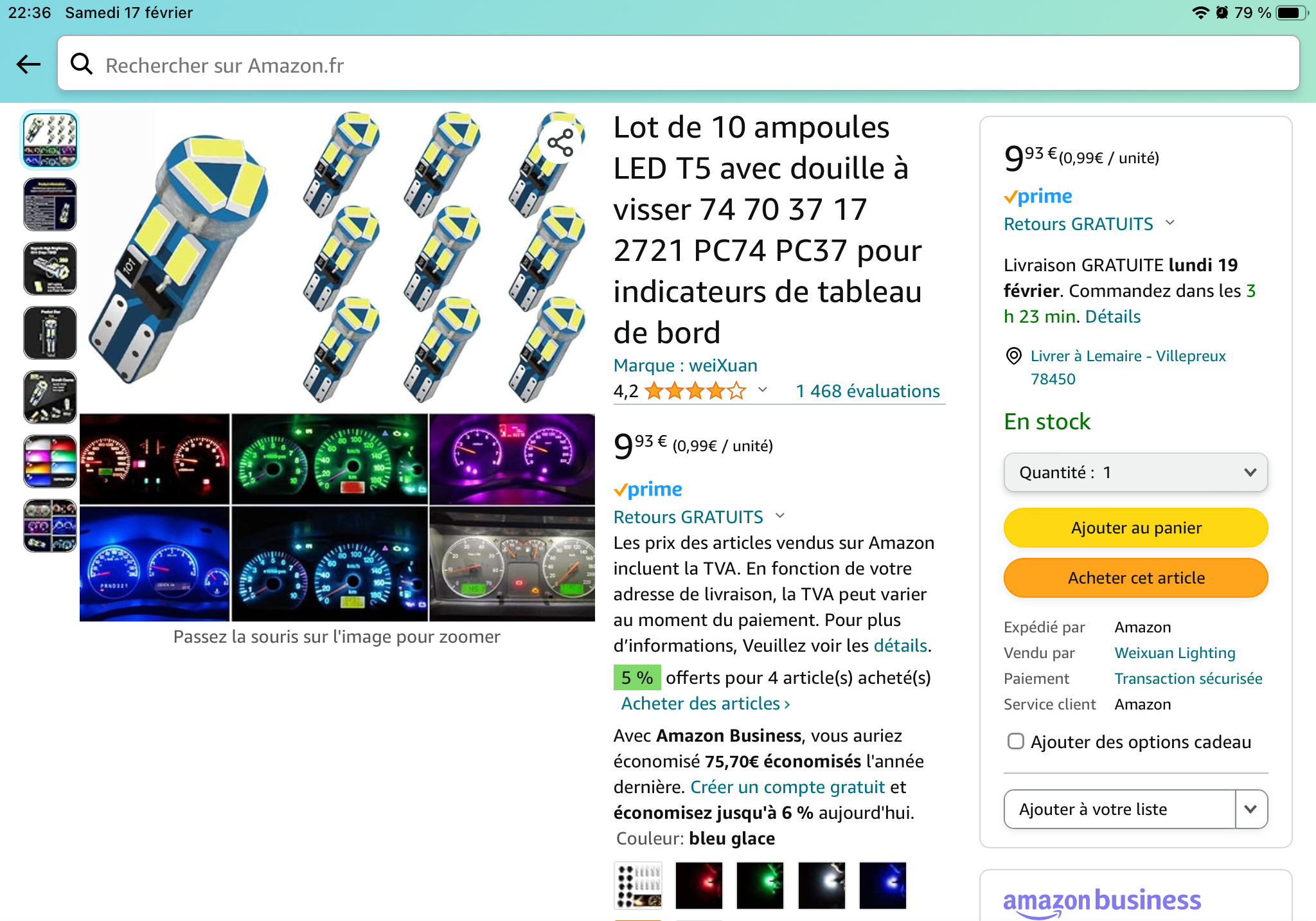 Après longues hésitations j’ai pris un jeu de 4 H4 Led chez AGM Vision données pour 3000 lumens et donc les led sont teintées dans la masse. La conso est donnée pour 2,2A par ampoule (je pense par fonction), ce qui est nettement plus raisonnable que les anciennes.
