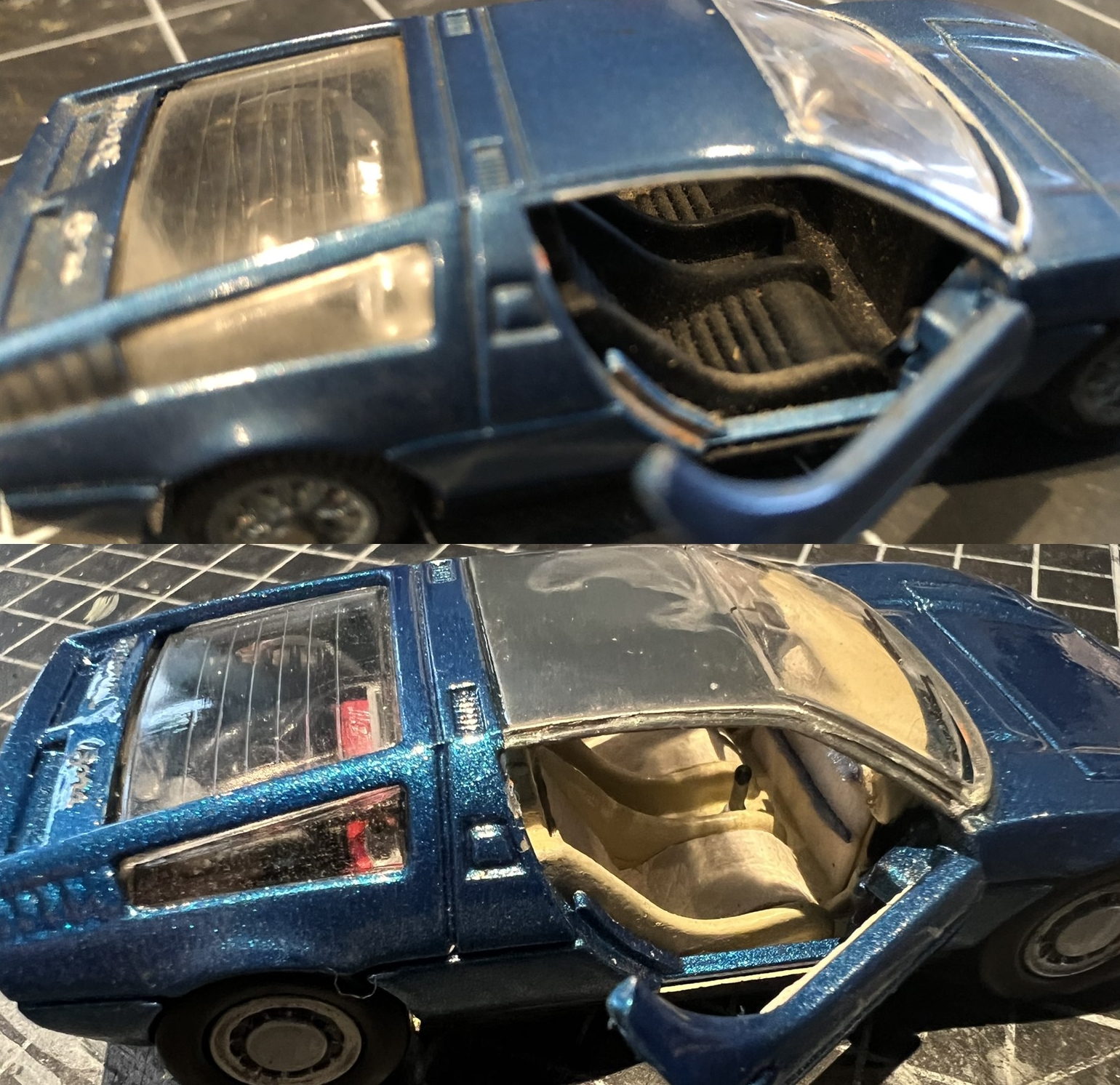Pour le reste, après nettoyage à la solution vinaigrée ( 20%), je repeinds l'intérieur en beige. Je fais les contre-portes et les sièges en cuir beige. J'adapte un tableau de bord issu de mon stock de pièces détachées. Je modifie et repeinds des roues d'une BORA G&P en statut épave. J'en profite pour adapter feux arrières, calandre et parechocs + un rétro. J'ai customisé aussi l'arrière avec un moteur visible et plus détaillé.