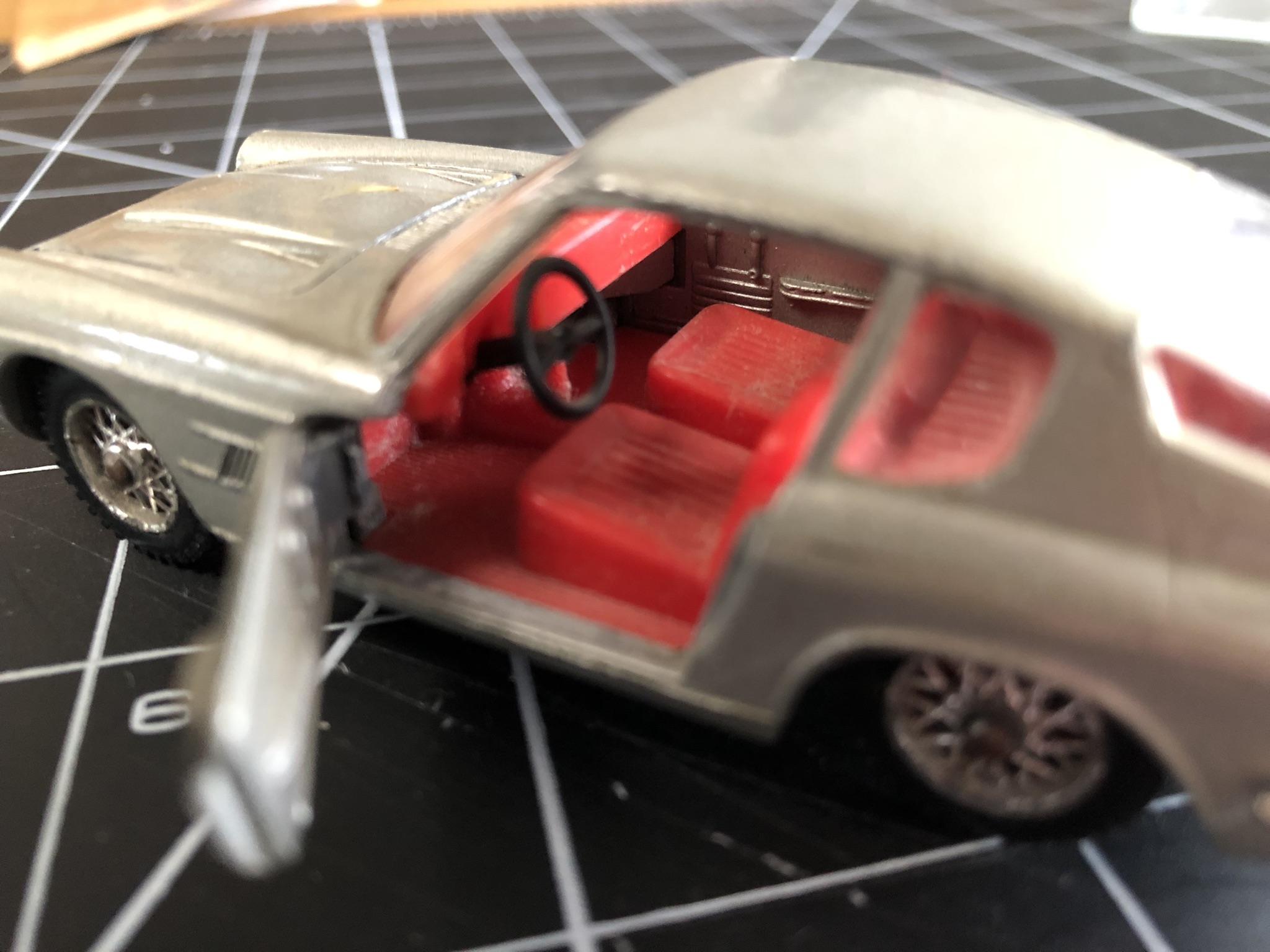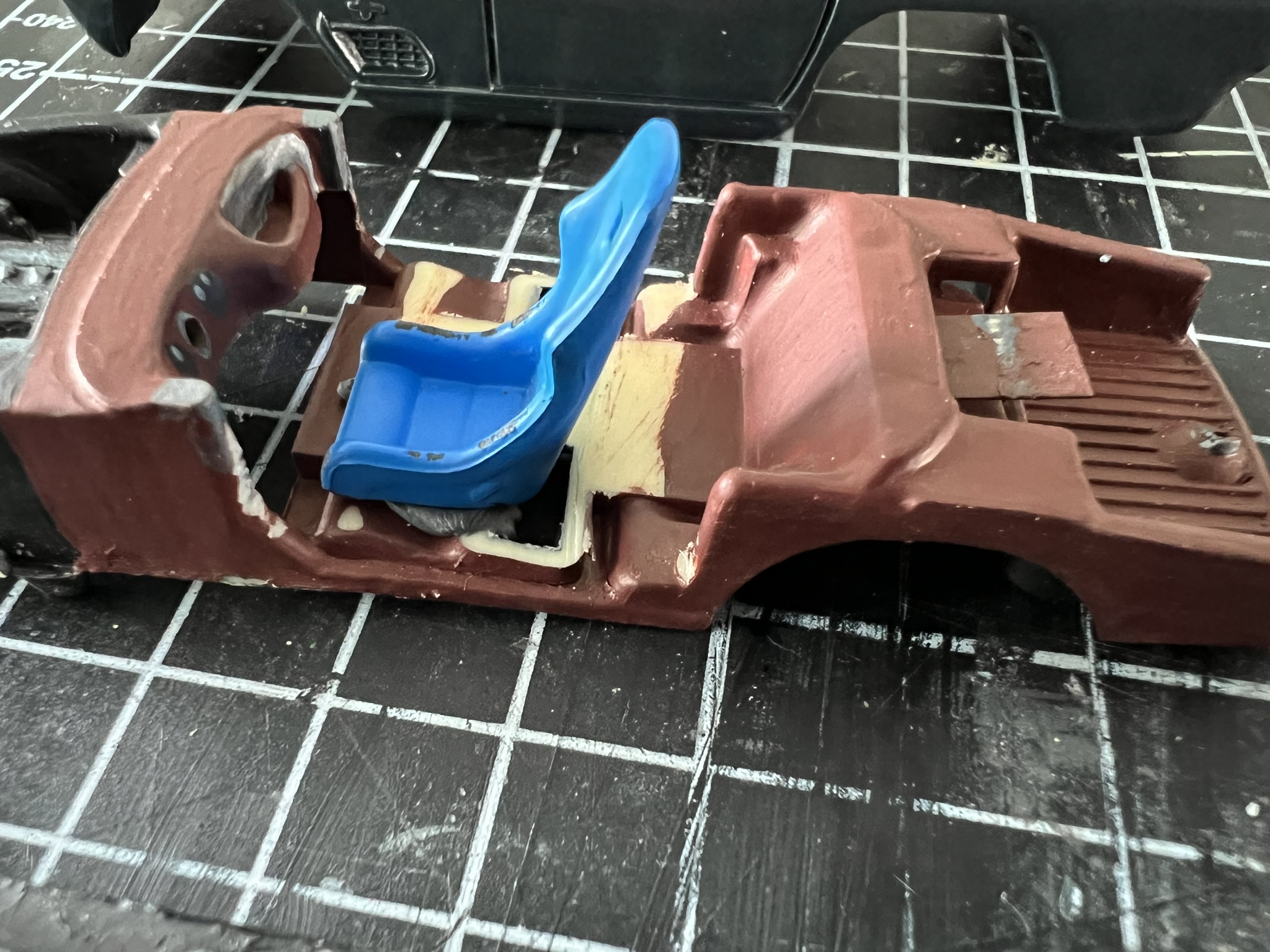 Et je dois ajuster un intérieur complet en mode course : Je prends une 4200GT Trofeo abimée qui donnera arceau, volant, siège et extincteur. Autant le faire avant la finition peinture.