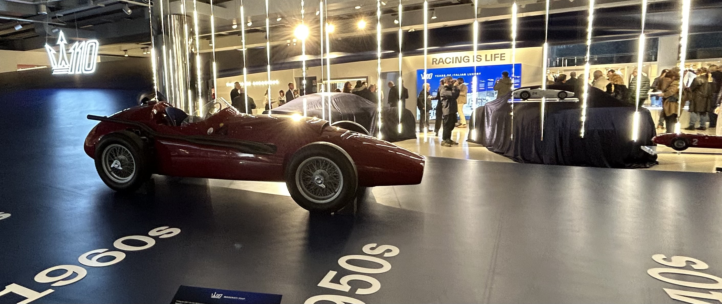 Dès l’arrivée au show-room de l’usine Maserati, on tombe sur la sublime 250F V12 du musée Panini. On distingue derrière deux voitures sous housse bleue :