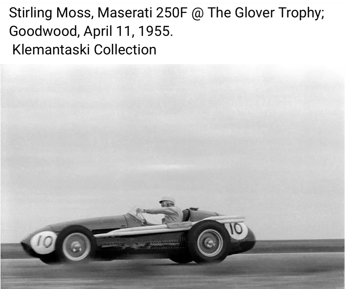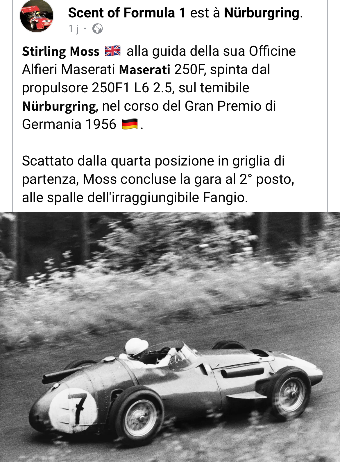 Moss et son célèbre casque blanc à la conquête de la seconde place au Nurburgring 1956 sur la sublime Maserati 250F :