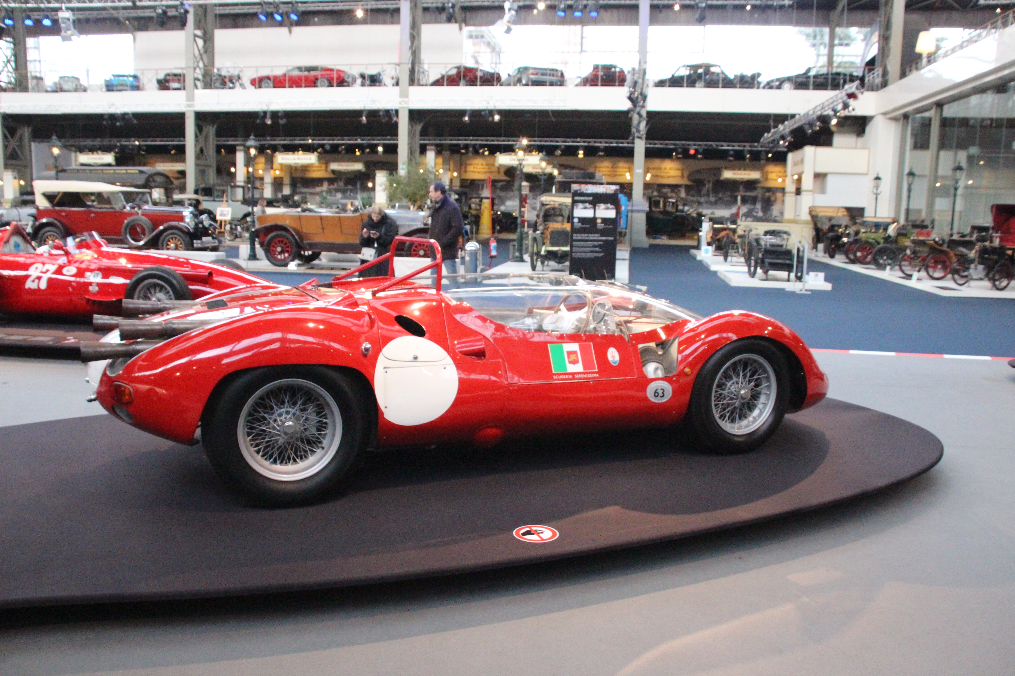 Dès l'entrée, ça commence fort, avec la maintenant bien connue 420M/58 au couleur d'Eldorado, moulte fois vue chez Panini (j'ai toujours eu un gros faible pour cette livrée), la 250f en avant plan, et une tipo 63 de l'écurie serenissima (à chaque fois que je vois l'intérieur de ces birdcage, je ne peux m'empêcher de penser au martyr de Saint Sebastien, il fallait avoir confiance).