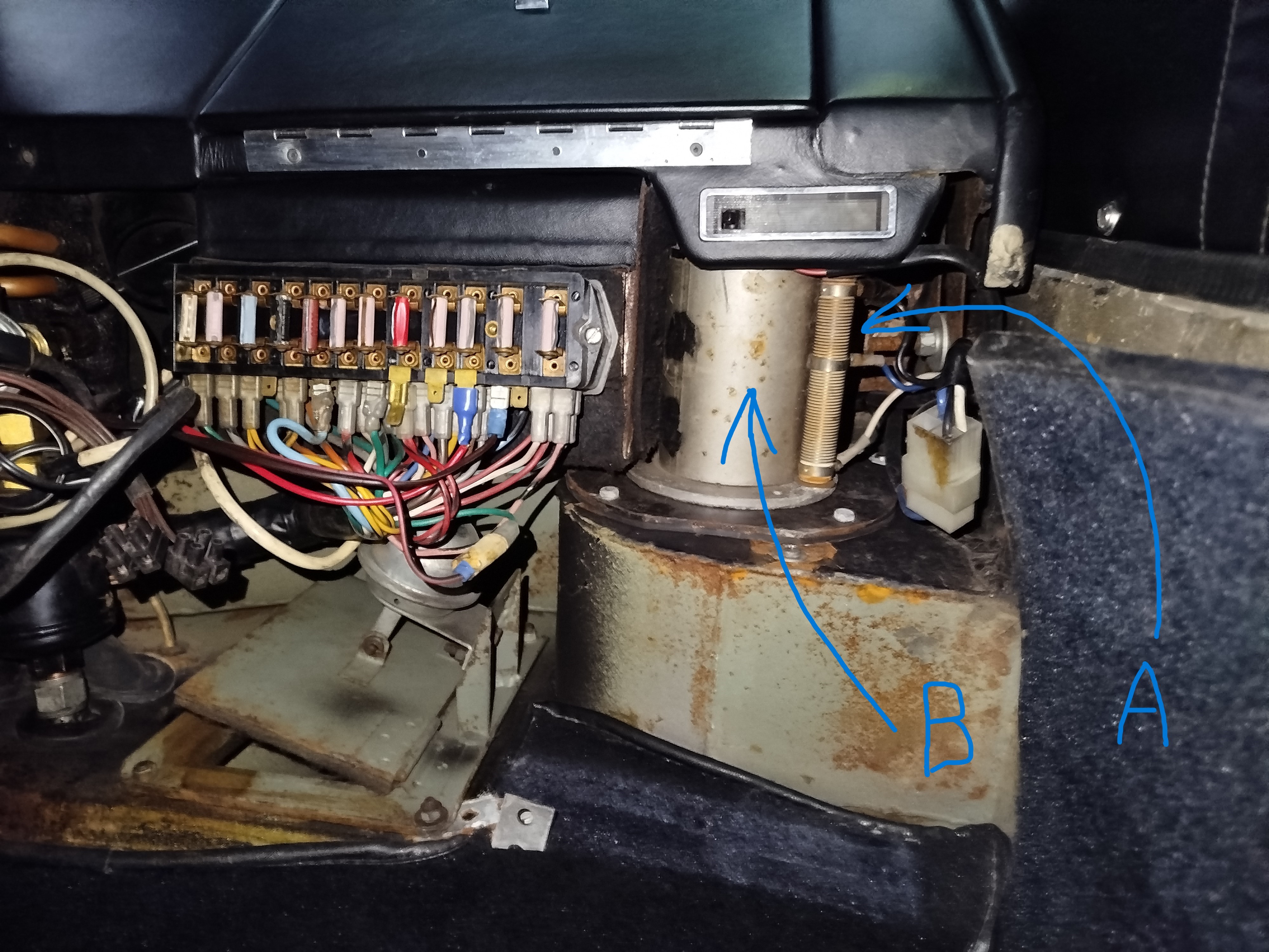Malheureusement la centrale clignotante A reste quasiment inaccessible derrière un gros cylindre métallique B dont j'ignore la fonction.