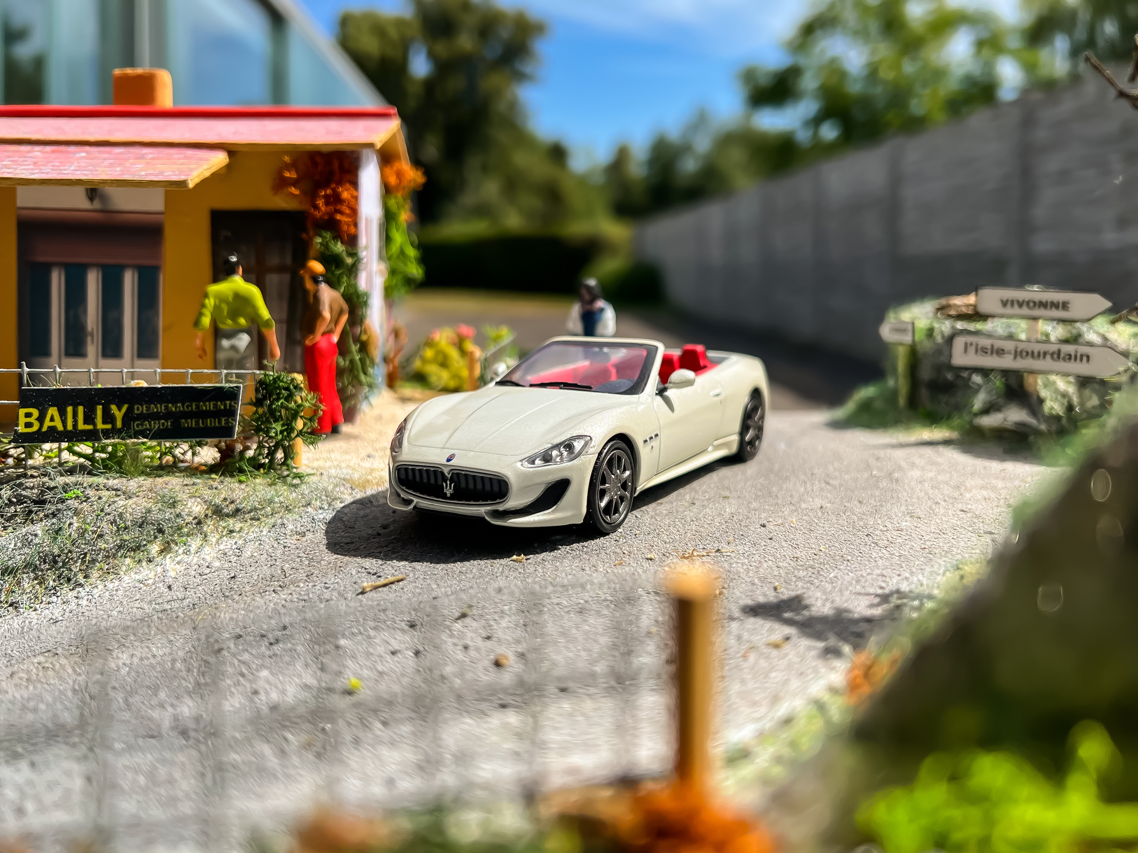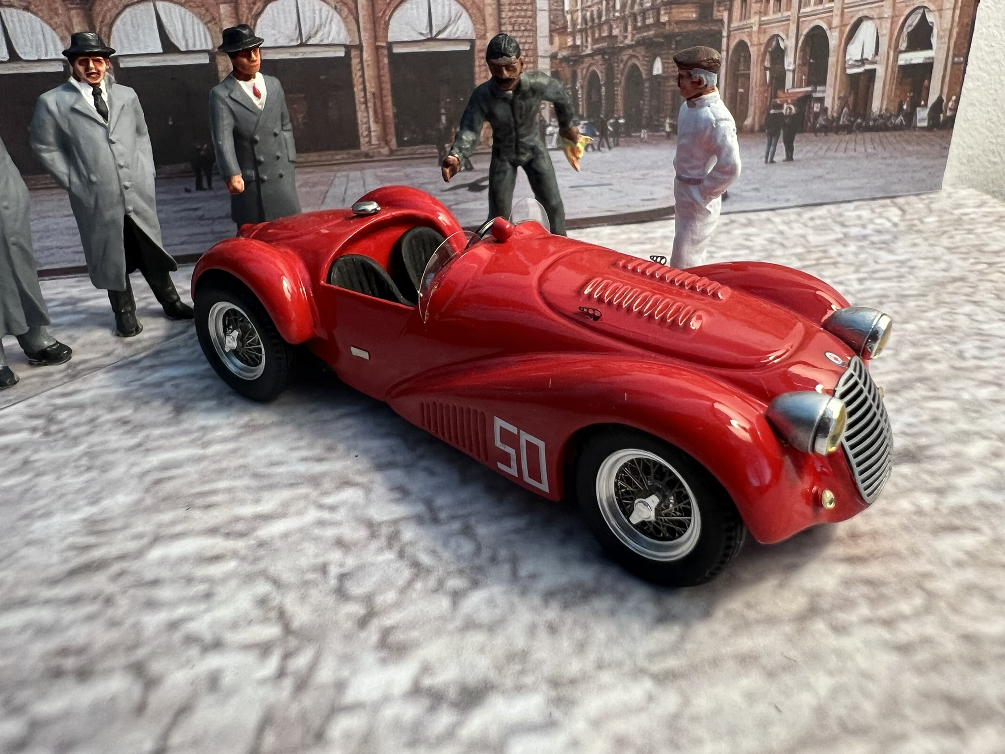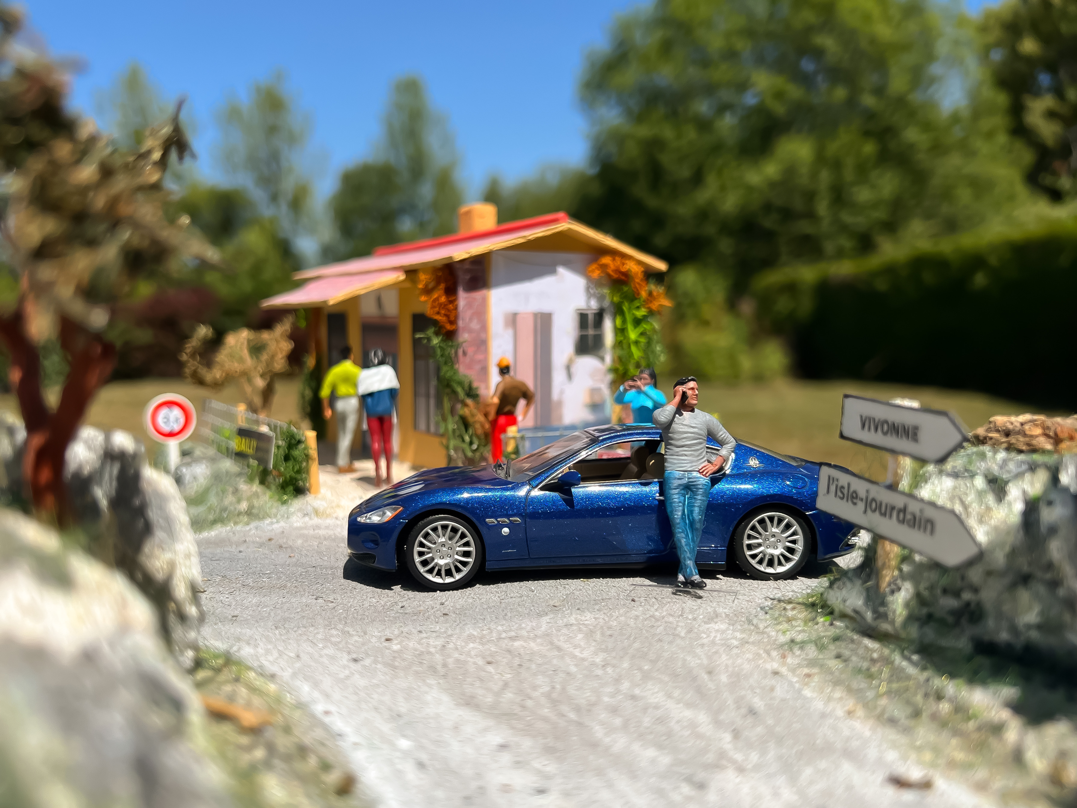 Je suis sûr que tu as noté malgré tout que la miniature a un capot plus court que la vraie, ce que l'on peut voir sur l'aile avant entre les ouïes (les 3 fameuses) et le sigle Pininfarina : il s'agit d'un kit SHMR assez ancien réalisé à partir de photos, je suppose que ceux qui ont fait le moule n'ont pas eu accès aux dimensions réelles.