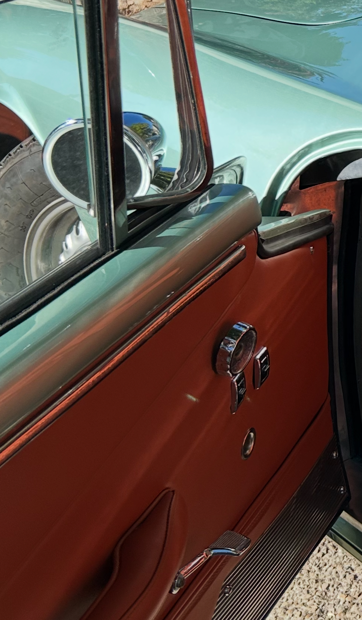 Poignée d’ouverture de porte en bas et, du côté conducteur, les deux interrupteurs de vitres électriques, un pour chaque côté (un seul côté passager) : Le tout petit rétroviseur est aussi très beau mais mal lisible. Ce modèle est plus souvent placé plus en avant, au sommet de l’aile avant où il est plus efficace. A noter aussi le déflecteur, bien utile pour envoyer l'air dans l'habitacle quand on roule et pour réduire les turbulences et les bruits de vent quand on roule vitre latérale baissée.