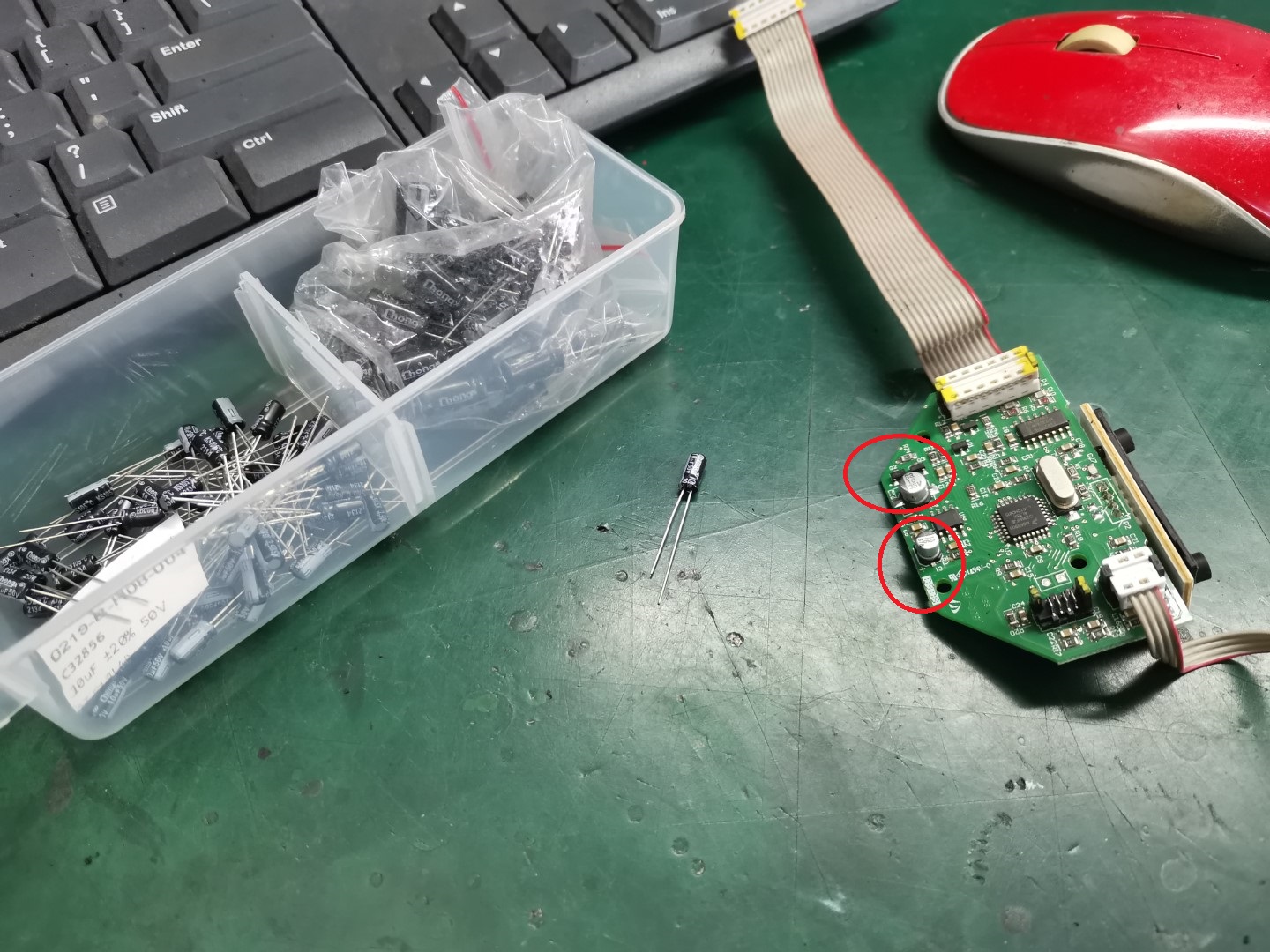 Pour ma part je n'avais pas les memes condensateurs que les originaux en stock du coup j'ai pris ce que j'avais sous la main c'est a dire 10microFarad et 50V. Meme capacite mais voltage plus important. Comme vous pouvez le voir ils n'ont pas la meme forme mais on s'en fiche totalement, ca n'a aucune importance.